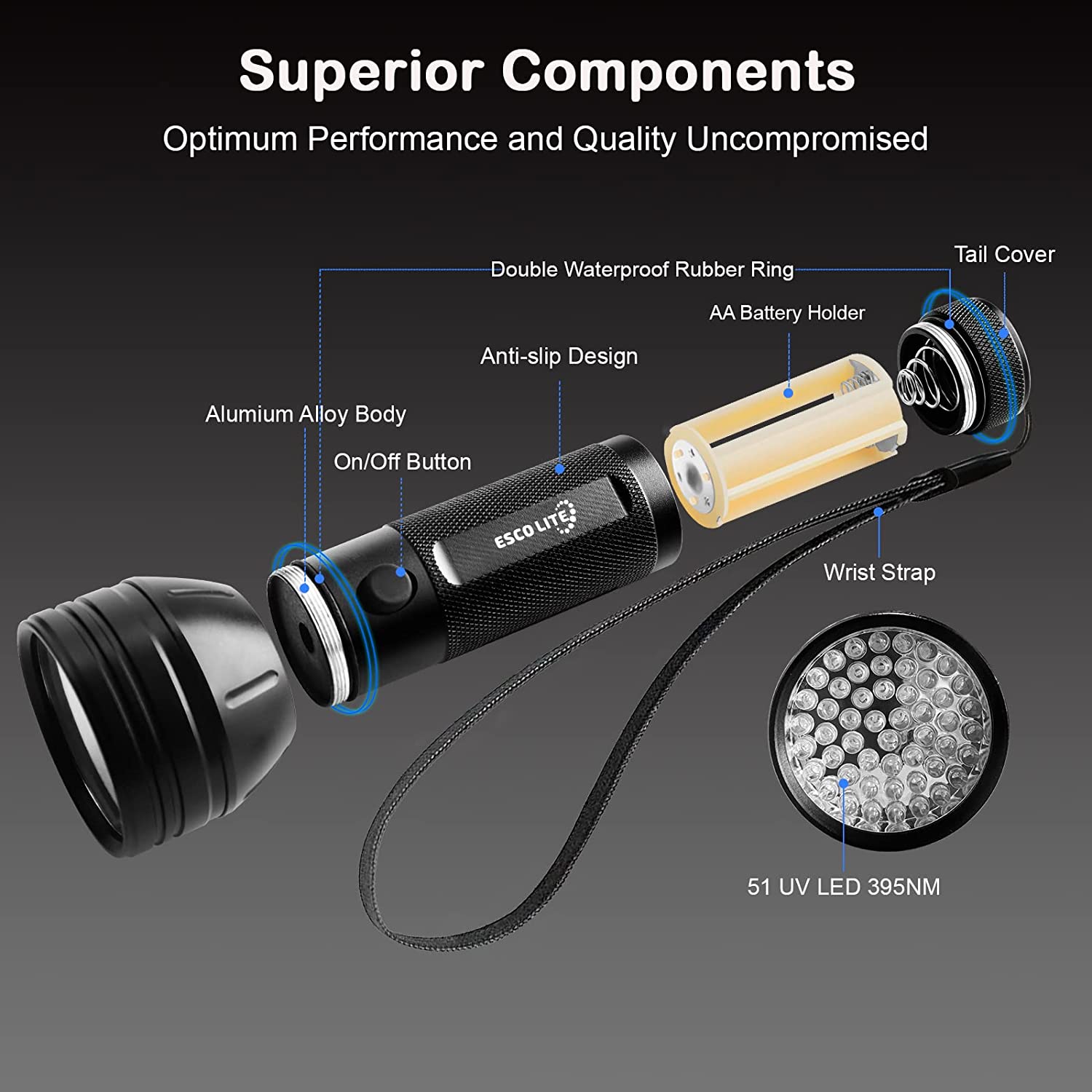Escolite UV Flashlight Black Light, 51 LED 395 nM Ultraviolet Blacklight Detector for Dog Urine, Pet Stains and Bed Bug