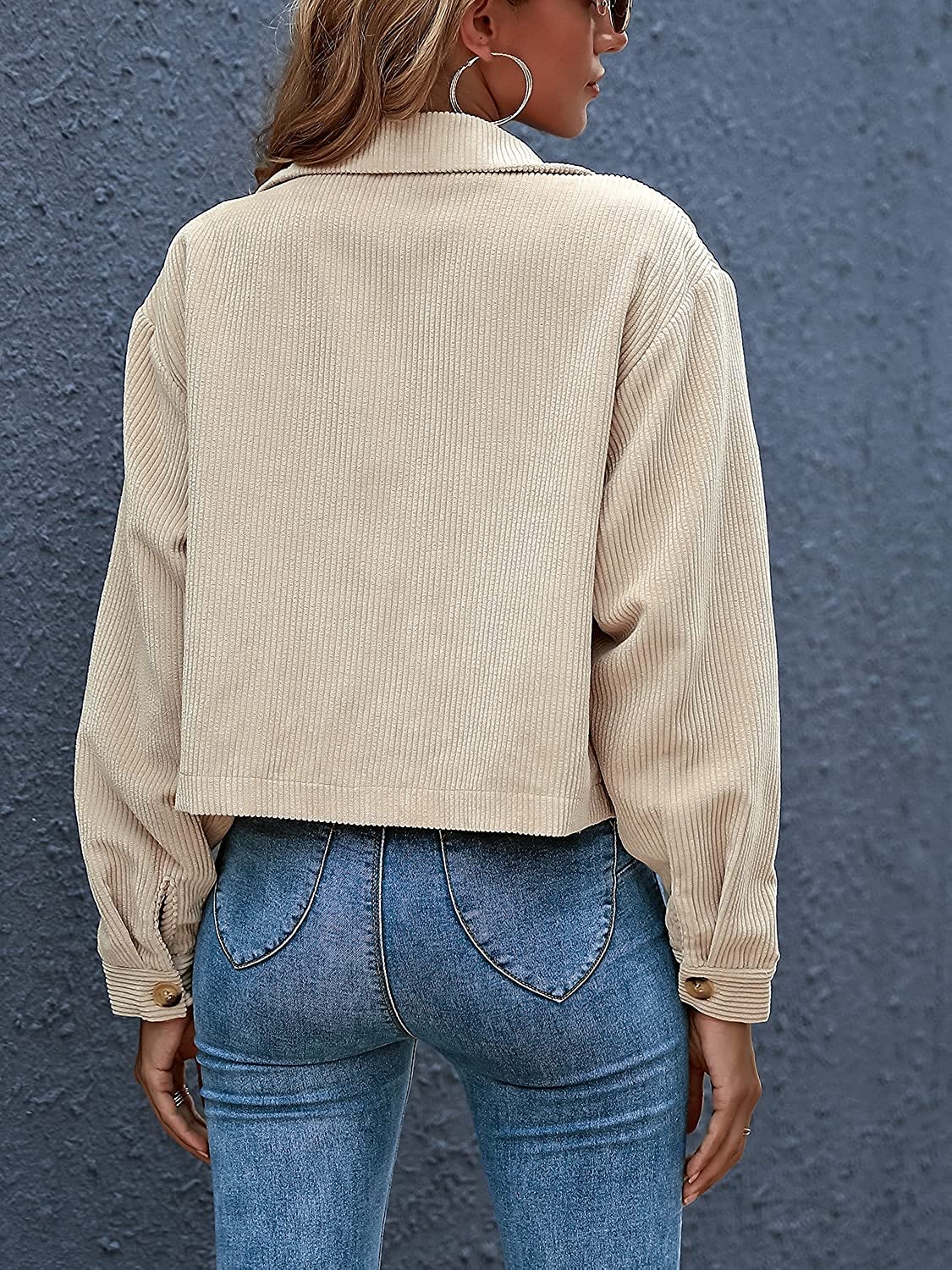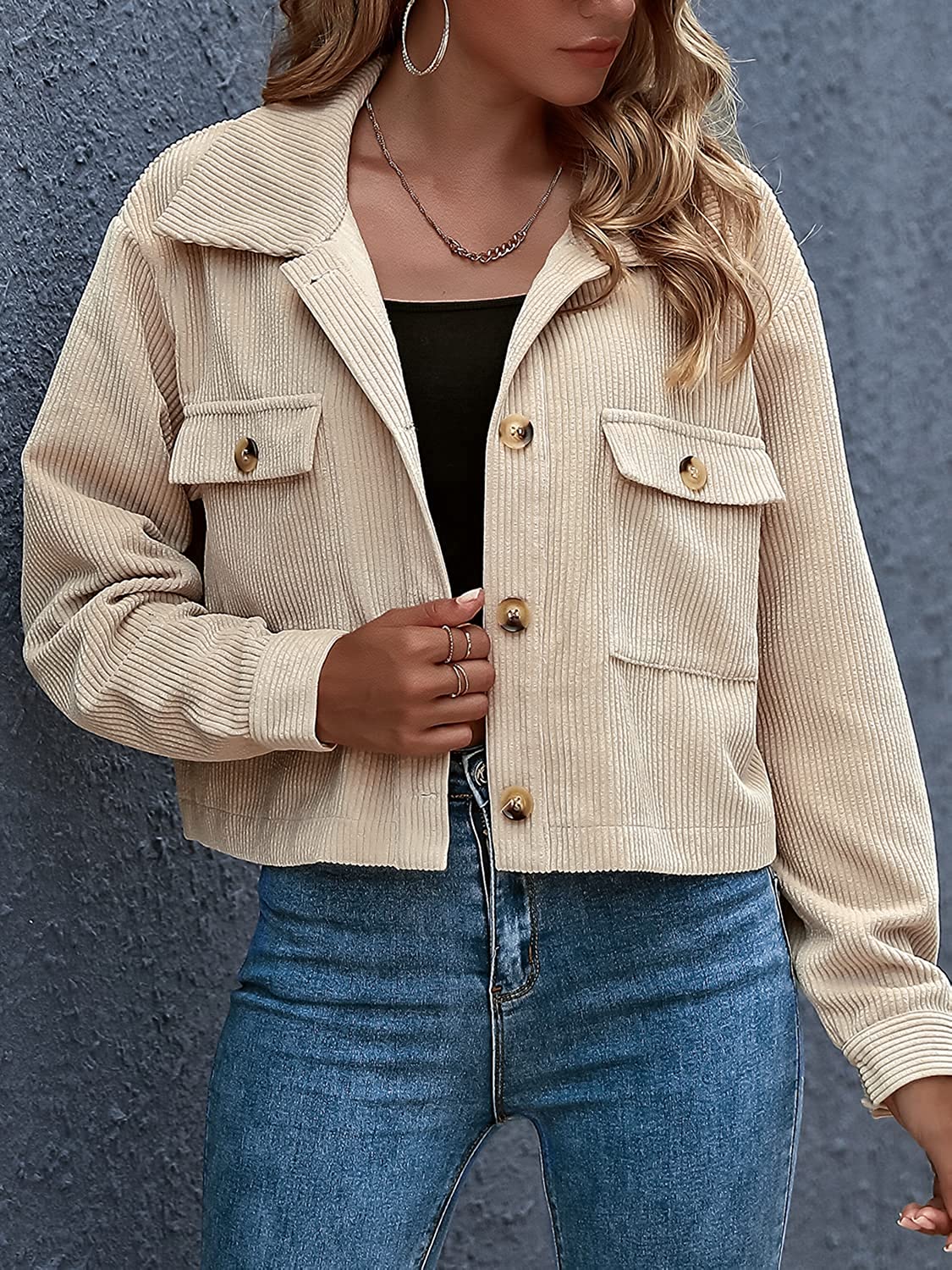 Eteviolet Women's Casual Cropped Corduroy Jackets Button Down Long Sleeve Shirts Jacket With Pockets
