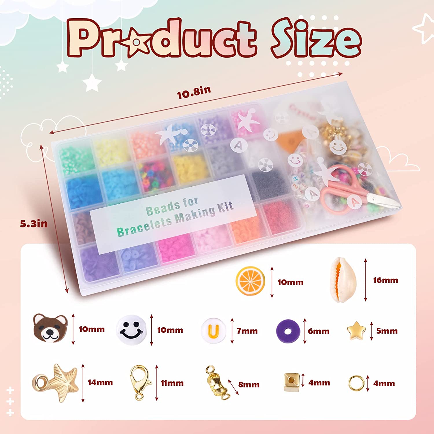 FZIIVQU Clay Heishi Beads Kit with Smiley Face Beads for Bracelets Making 5280+ Polymer Preppy Flat Clay Beads for Jewelry Making Set Lnclude UV Letter Beads & Fruit Animal Gold Star Spacer Beads etc