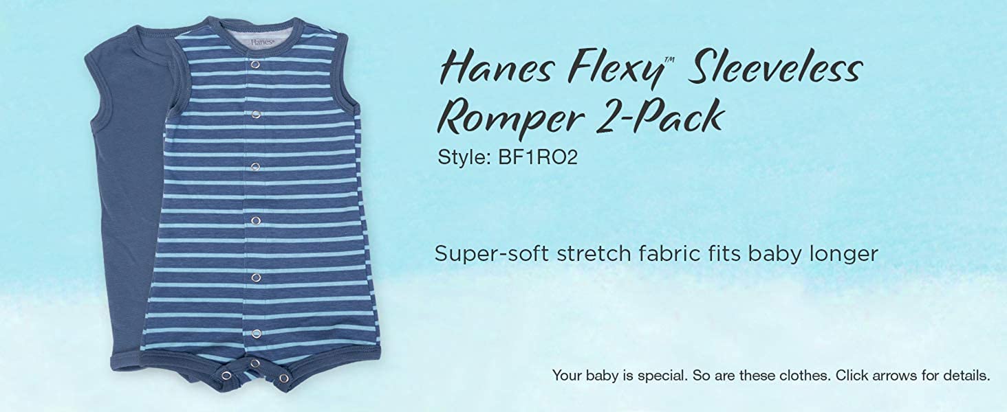 Hanes Ultimate Flexy 2 Pack Sleeveless Rompers were designed with baby in mind. They are super soft, flexible, and are available in 4 simple sizes to fit baby longer.