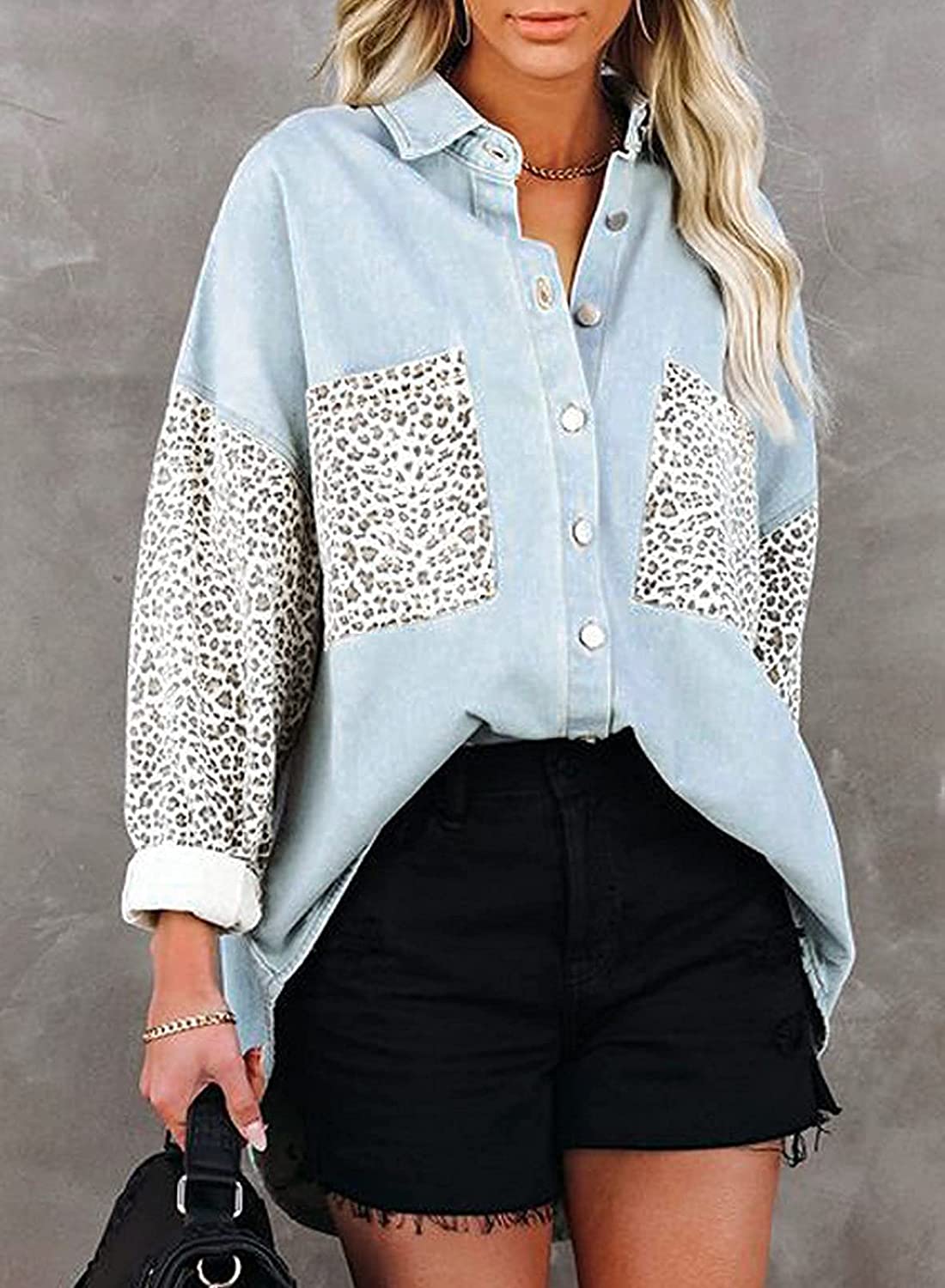 Happy Sailed Womens Leopard Contrast Denim Jackets Oversized Long Sleeve Button Down Jean Shacket Jacket S-2XL