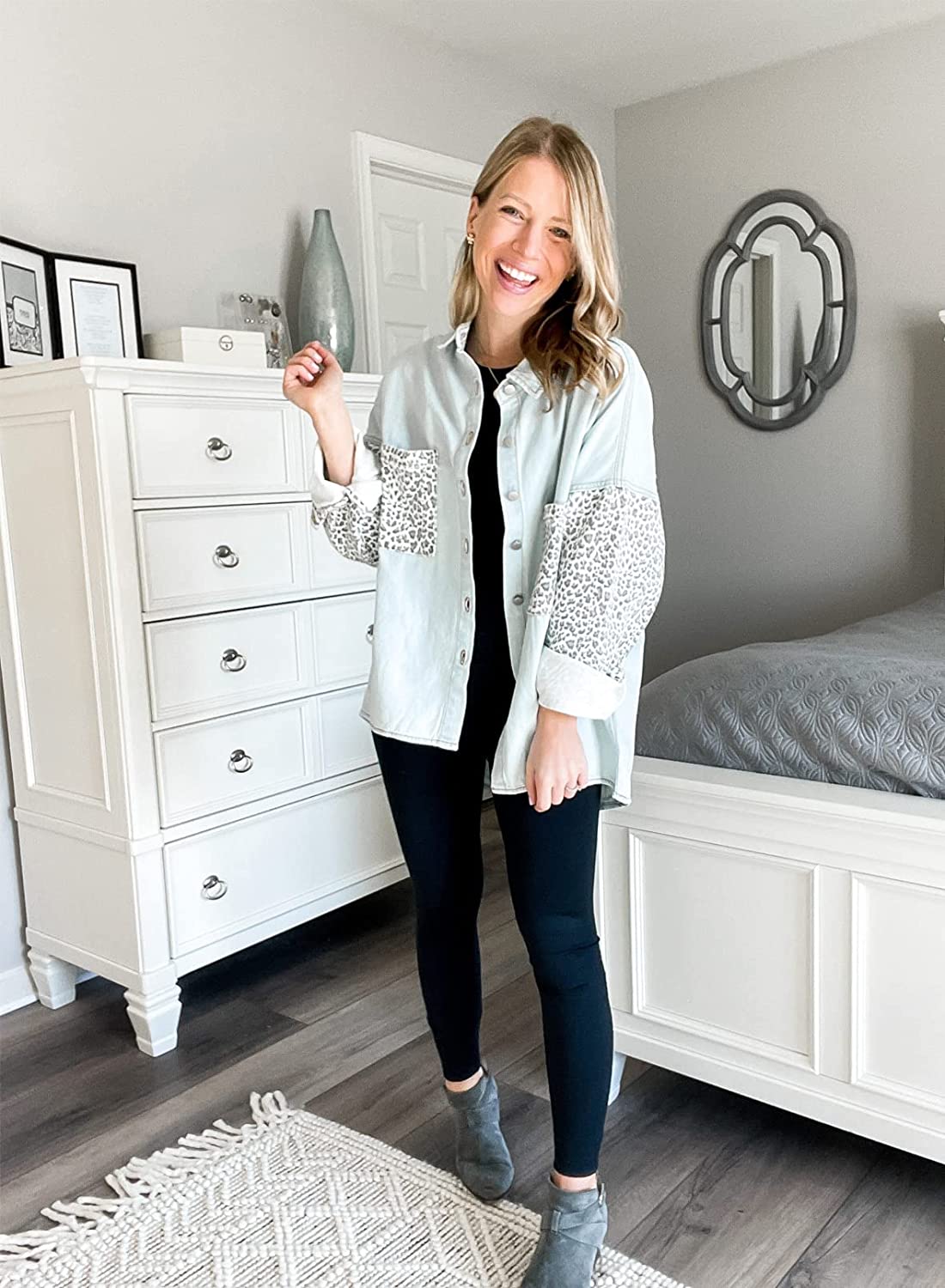 Happy Sailed Womens Leopard Contrast Denim Jackets Oversized Long Sleeve Button Down Jean Shacket Jacket S-2XL