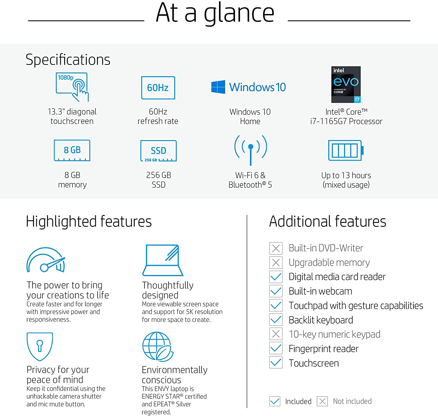 HP ENVY 13 Laptop, Intel Core i7-1165G7, 8 GB DDR4 RAM, 256 GB SSD Storage, 13.3-inch FHD Touchscreen Display, Windows 10 Home With Fingerprint Reader, Camera Kill Switch (13-ba1010nr, 2020 Model)