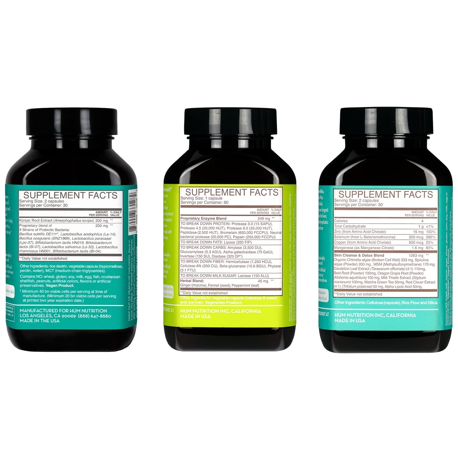 HUM Clear Skin & Body Detox Support Supplement Set with Daily Cleanse Skin Supplement, Flatter Me Digestive Enzymes and Skin Squad Pre+Probiotic (3 Products, 60 Vegan Capsules Each)