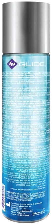 ID Glide is the premium award-winning water-based lubricant that has been America’s favorite for over twenty five years. This doctor recommended best-selling formula is designed for a smooth and natural feel. Non-staining and toy friendly, ID Glide is long lasting and can easily be re-activated with a few drops of water or saliva. It is sure to become your favorite lube! Whether you want to experience more pleasure, or need help with discomfort during sex or just want to spice things up in the bedroom, using the right lube for you can make all the difference. ID Lubricants, no one does it better! This formula is made in the USA and is FDA cleared. Available in 1 fl. oz., 2.2 fl. oz., 4.4 fl. oz., 8.5 fl. oz. dispensing cap bottles, 17 fl. oz., 64 fl. oz. and 1 gallon pump bottles, 12 ml., 2 fl. oz., 4 oz. tubes.