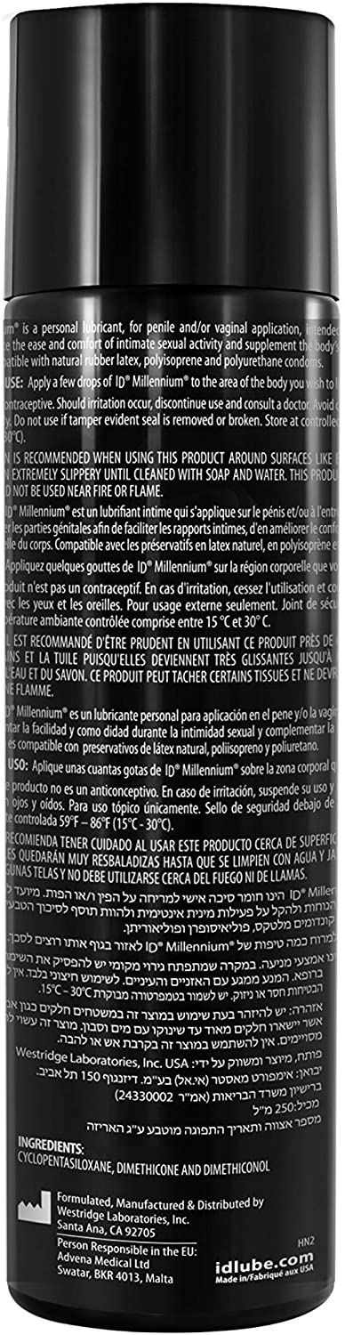 If you are looking for a lubricant that feels slick and is long lasting, look no further than ID Millennium. Made from the highest quality, pharmaceutical grade silicone, ID Millennium is our best-selling silicone based lubricant. It is Ultra-long lasting, never sticky or tacky that won’t dry you out or dissolve even under water! Use it in the shower, bath, hot tub or anywhere else your encounter takes you without having to worry about stopping. This super-concentrated silicone formula is even great for body massages and gentle skin conditioning. Just a little goes a long way when using ID Millennium, so use sparingly and enjoy long lasting pleasure. Whether you want to experience more pleasure, or want help with discomfort or want to spice things up in the bedroom, using the right lube for you can make all the difference. ID Lubricants, No one does it better! Available in 1 fl oz, 2.2 fl oz, 4.4 fl oz, 8.5 fl oz dispensing cap bottles, 17 fl oz, 64 fl oz and 1 gallon pump bottles, 12ml tubes. To remove possible stains, use an extra strength detergent with a degreasing component.