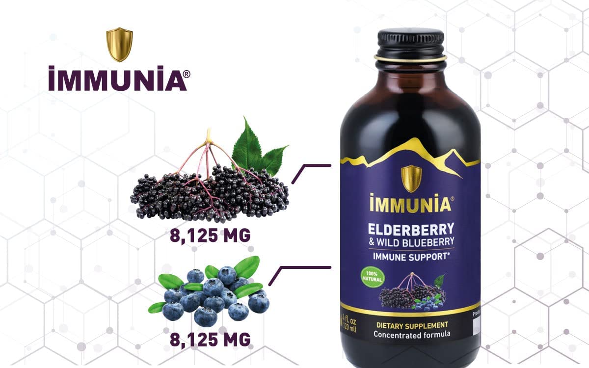 Immunia Elderberry & Wild Blueberry Concentrated. Immune Support. Delicious Taste. No Sugar Added. 24 Days/Bottle.