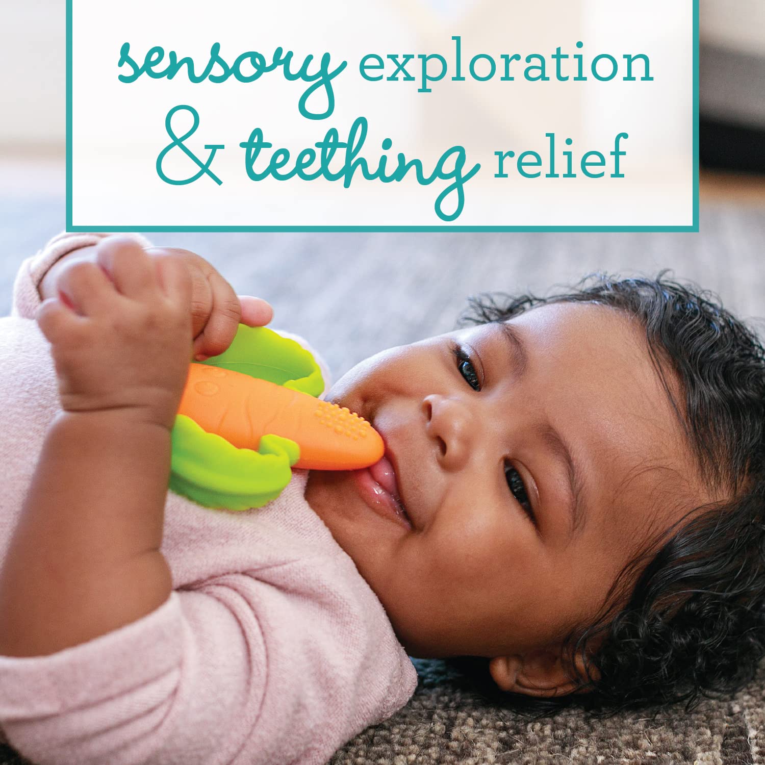 Infantino Little Nibble Teethers Product Description: Material: BPA-free silicone Colors: Orange and green Age Range: 0+ months Dimensions: 3.5 x 1 x 4 inches Weight: 2.4 oz