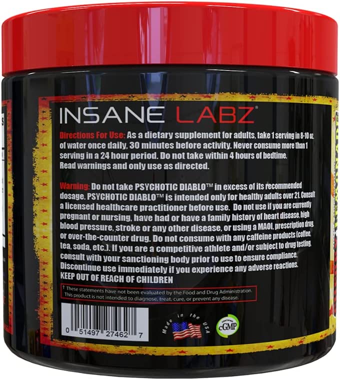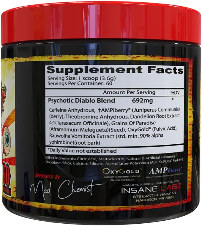 Insane Labz Psychotic Diablo Thermogenic Fat Burner for Men and Women with Grains of Paradise Theobromine Dandelion Root Extract Fueled by AMPiberry, Appetite Suppressant - 60 Servings