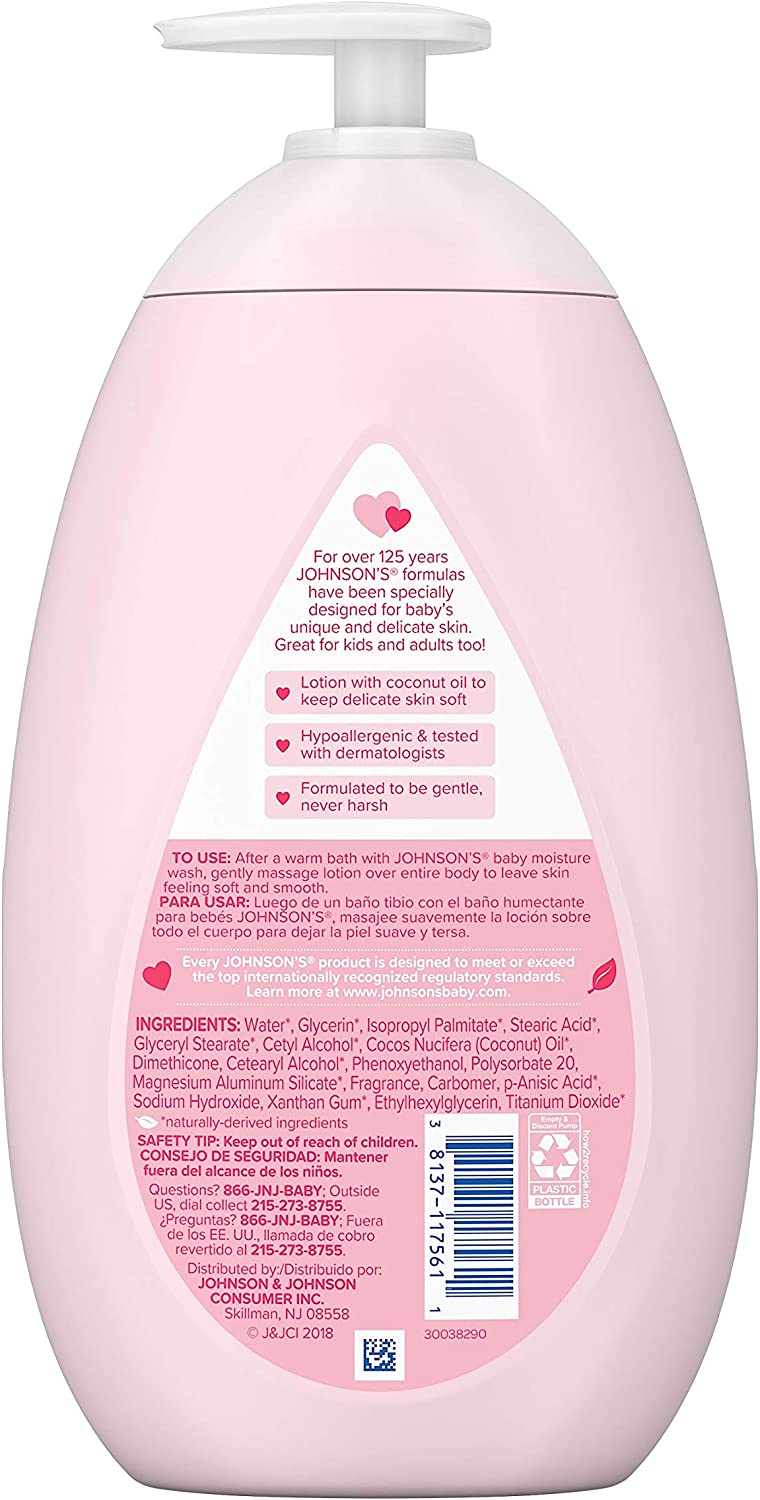 Nourish your little one's skin with Johnson's Baby Body Lotion. Gentle enough for babies and suitable for the whole family, this moisturizing pink baby lotion with coconut oil hydrates dry skin for a full 24 hours to keep delicate skin baby soft. Dermatologist- and pediatrician-tested, the improved formula of this pink baby body lotion is designed with input from parents like you. Clinically proven mild, it is hypoallergenic, free of parabens, phthalates, dyes, and harsh fragrances and is 100% gentle. Johnson's Baby Lotion can be used as part of a regular skin care routine by massaging into skin after a bath or any time baby has dry skin.