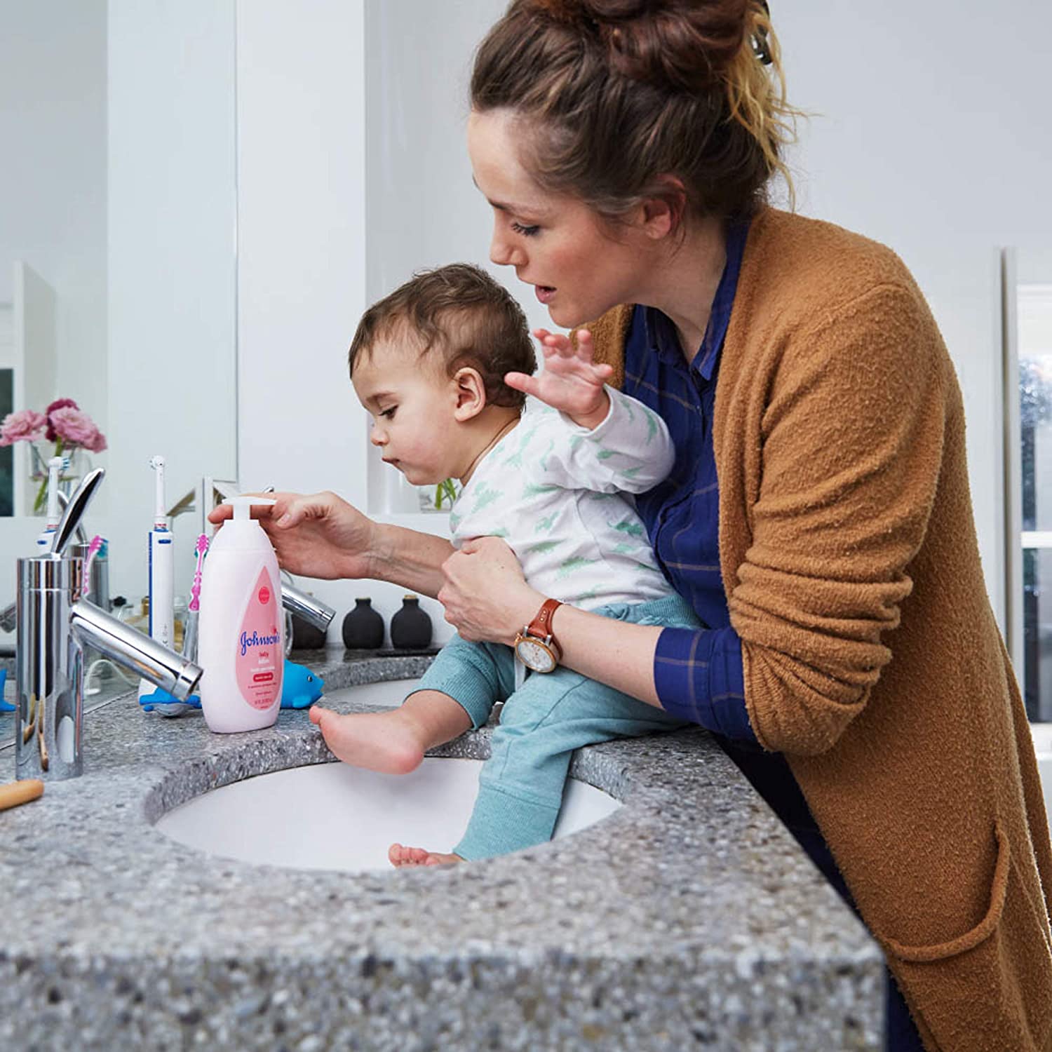 Nourish your little one's skin with Johnson's Baby Body Lotion. Gentle enough for babies and suitable for the whole family, this moisturizing pink baby lotion with coconut oil hydrates dry skin for a full 24 hours to keep delicate skin baby soft. Dermatologist- and pediatrician-tested, the improved formula of this pink baby body lotion is designed with input from parents like you. Clinically proven mild, it is hypoallergenic, free of parabens, phthalates, dyes, and harsh fragrances and is 100% gentle. Johnson's Baby Lotion can be used as part of a regular skin care routine by massaging into skin after a bath or any time baby has dry skin.
