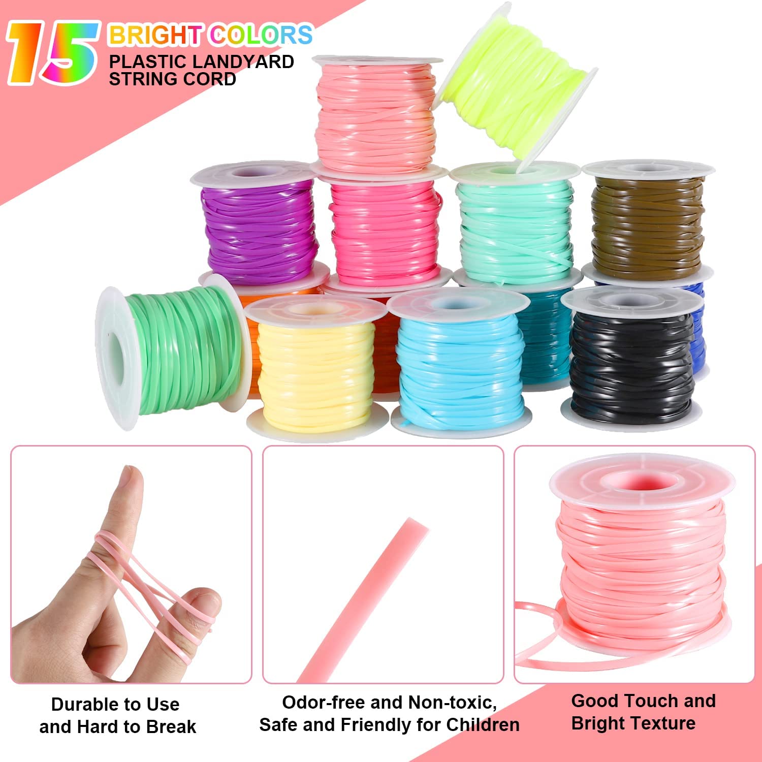 KAMJUNTAR Lanyard String,15 Rolls Gimp String Plastic Lacing Cord Plastic String Lanyard Kit for Friendship Bracelets Jewelry Making DIY Craft Boondoggle Gimp Bracelet Making Kit for Kids Girls