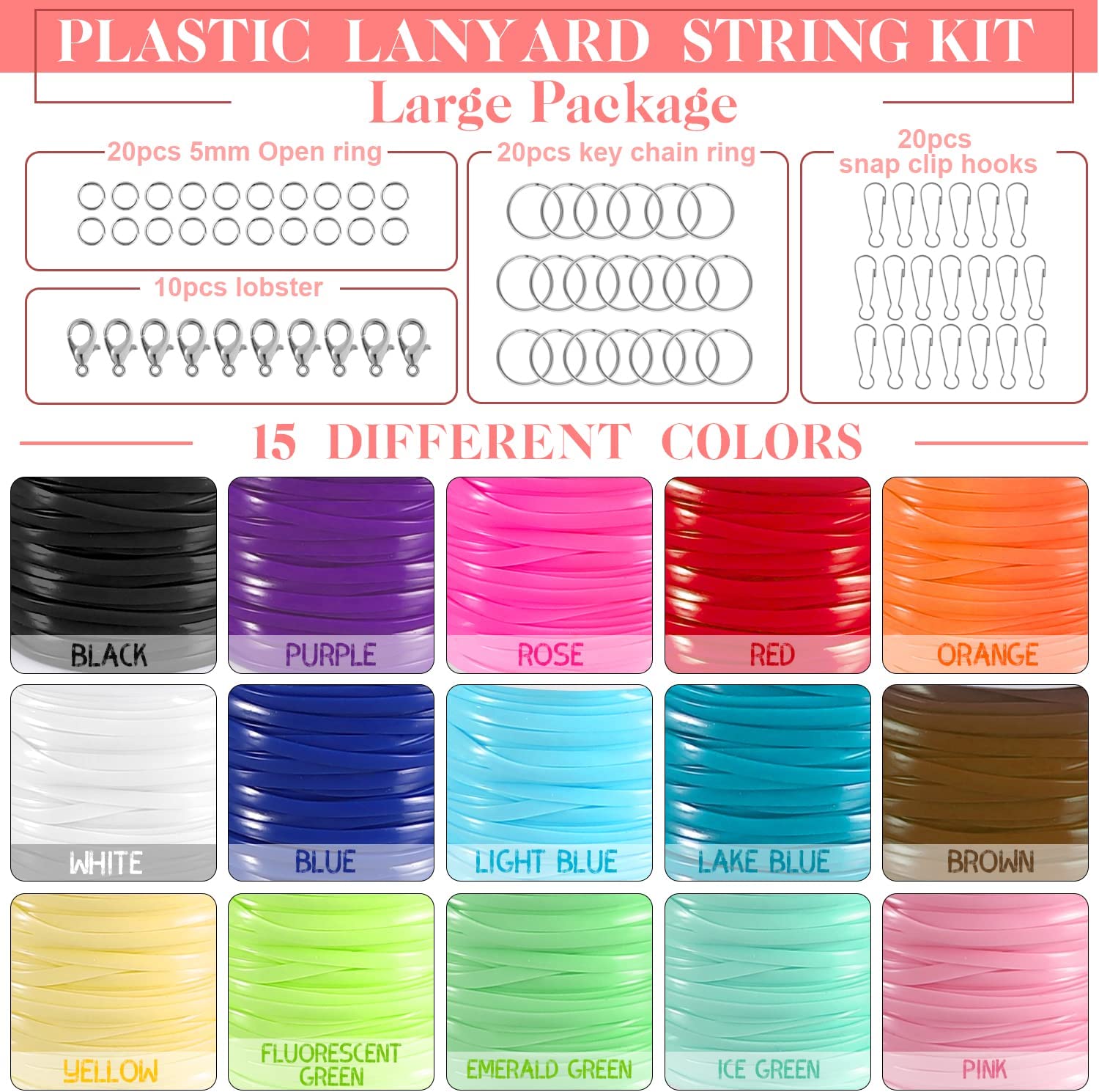 KAMJUNTAR Lanyard String,15 Rolls Gimp String Plastic Lacing Cord Plastic String Lanyard Kit for Friendship Bracelets Jewelry Making DIY Craft Boondoggle Gimp Bracelet Making Kit for Kids Girls
