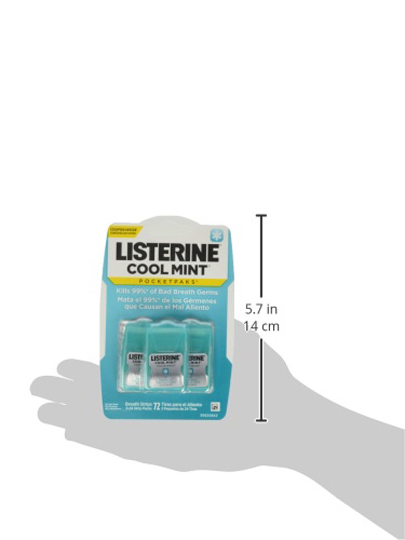 Refresh your bad breath with Listerine Cool Mint Pocketpaks Breath Strips, (Size variance). These mint breath strips dissolve instantly, killing 99 percent of germs that cause bad breath.* Slip your pack into your purse or pocket, so you can easily get fresh breath and kill bad breath germs after your morning coffee, or before an important meeting or date. Each breath strip has a refreshing Cool Mint flavor to leave your mouth feeling clean and fresh. *In laboratory tests.
