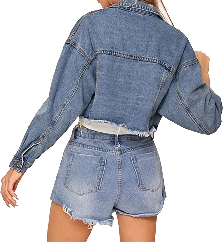 LONGYIDA Women's Jean Jacket Button Down Cropped Frayed Denim Jacket Coat