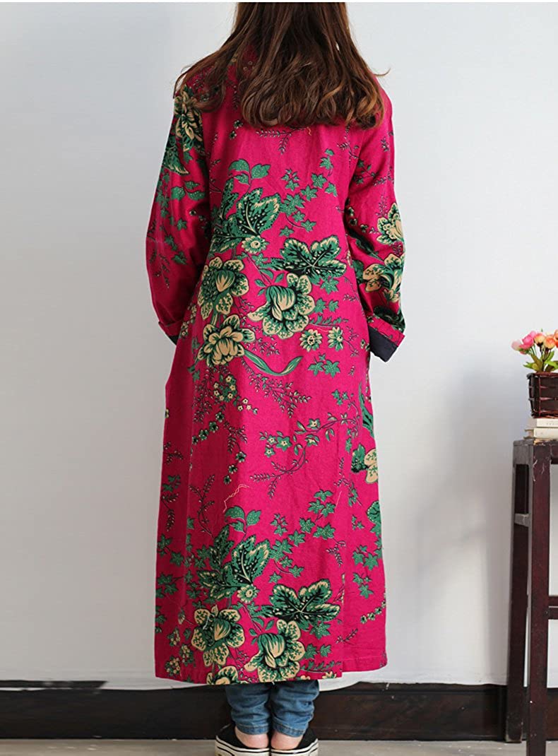 LZJN Women's Cotton Linen Trench Coat Floral Print Long Jacket with Pockets
