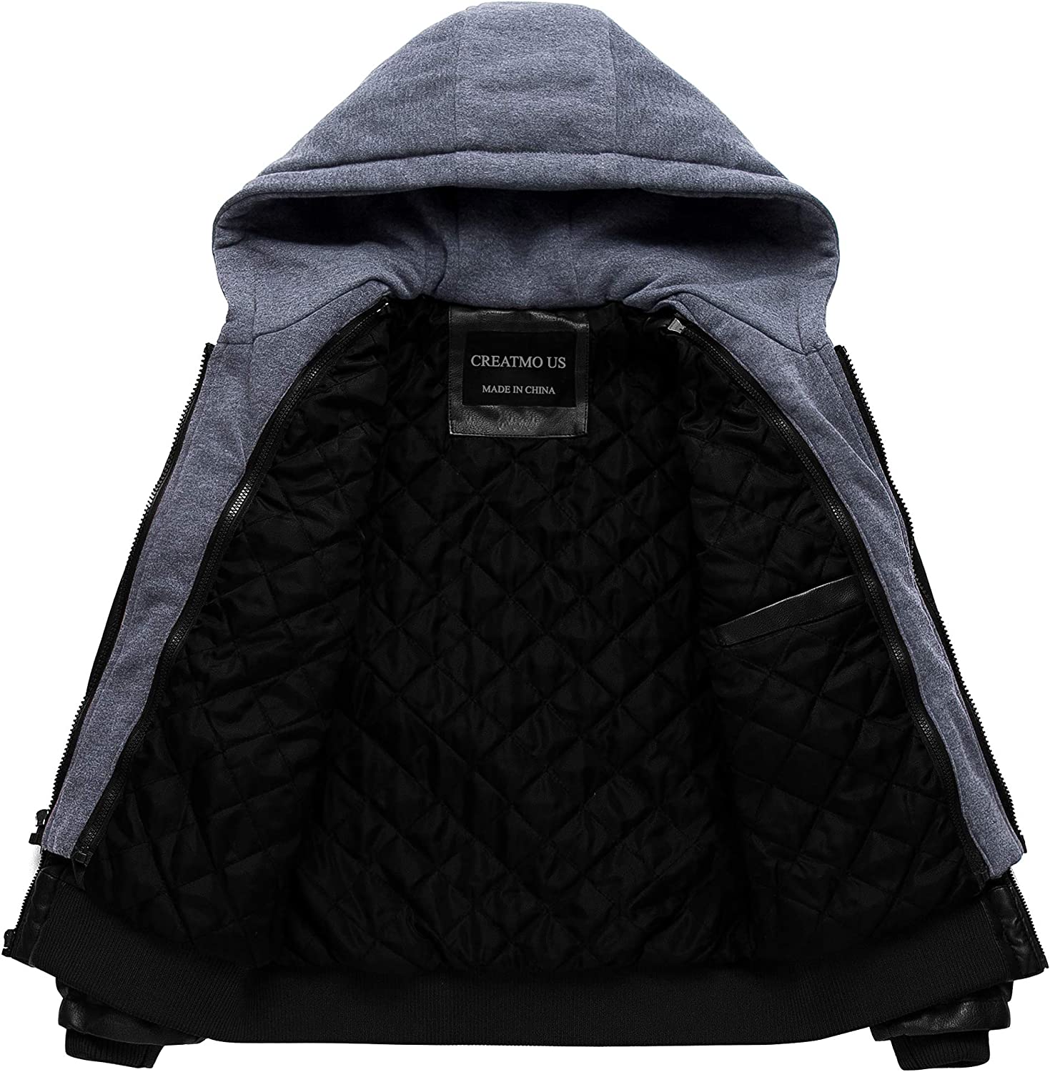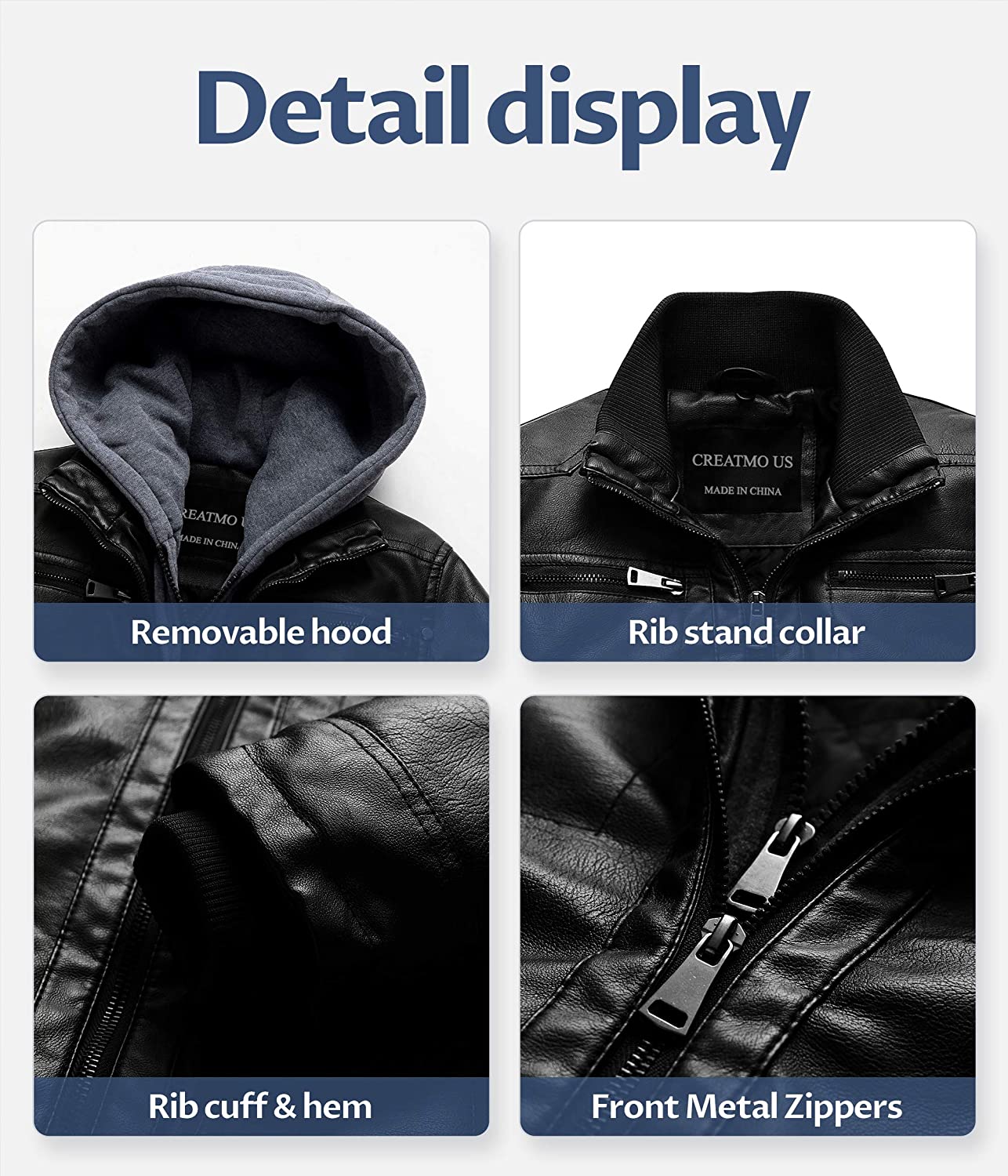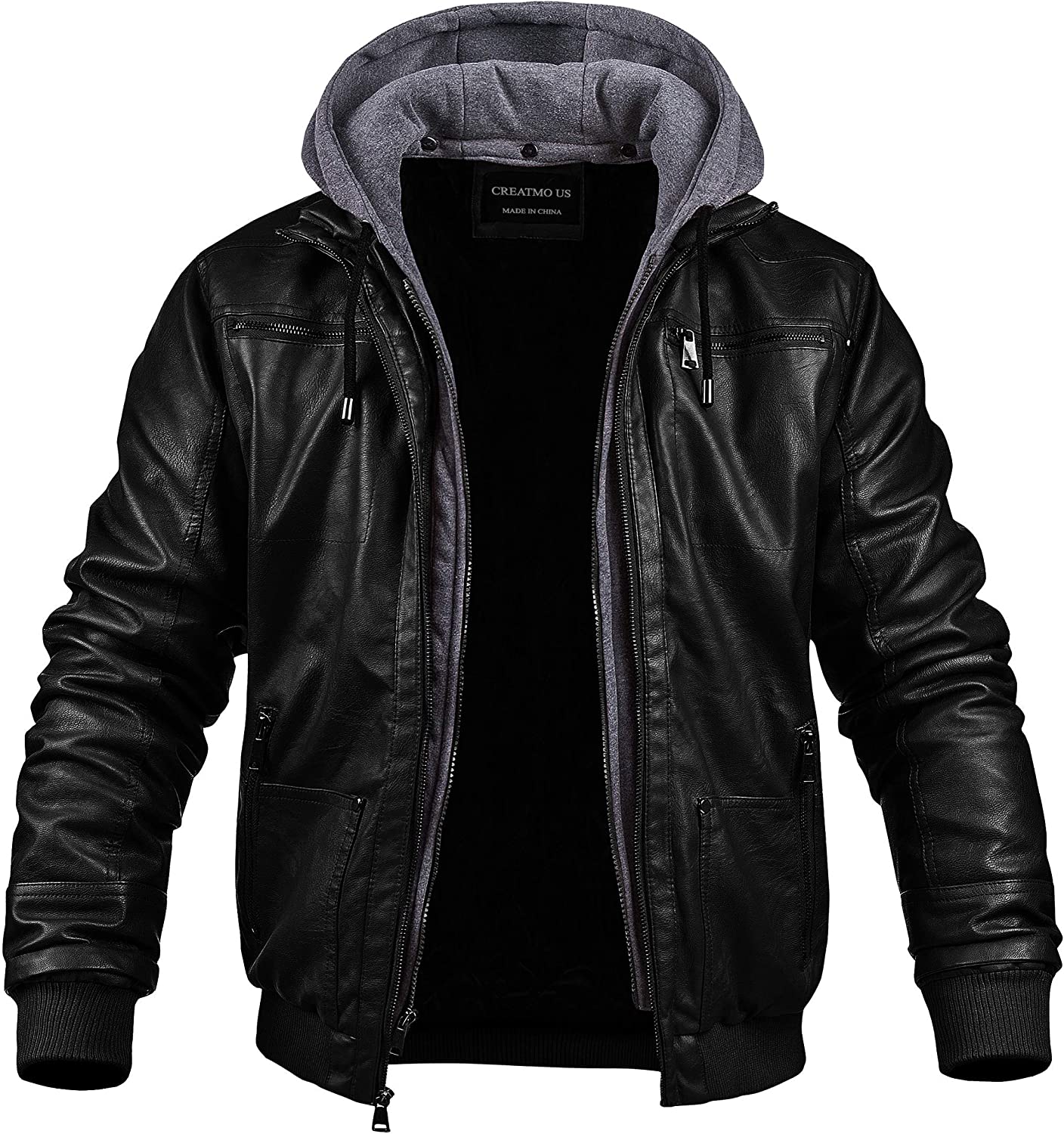 Men's Faux Leather Jacket Motorcycle Jacket Waterproof Windproof PU Moto Outerwear Vintage Bomber Hoodie with Removable Hood