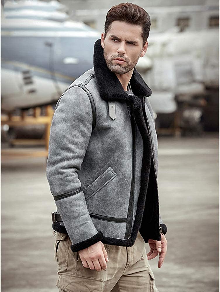 Mens Sheepskin Shearling Jacket B3 Flight Jacket Aviator Winter Coat Fur Bomber Leather Jacket Brown