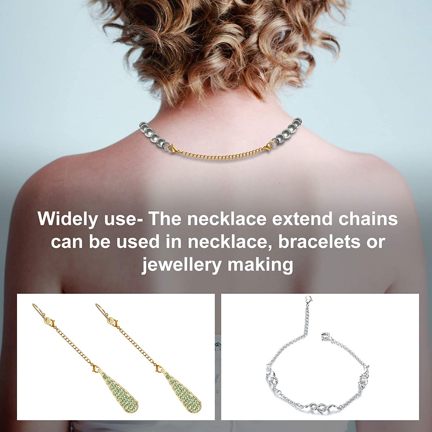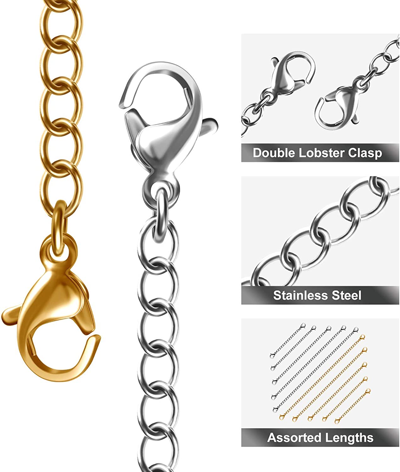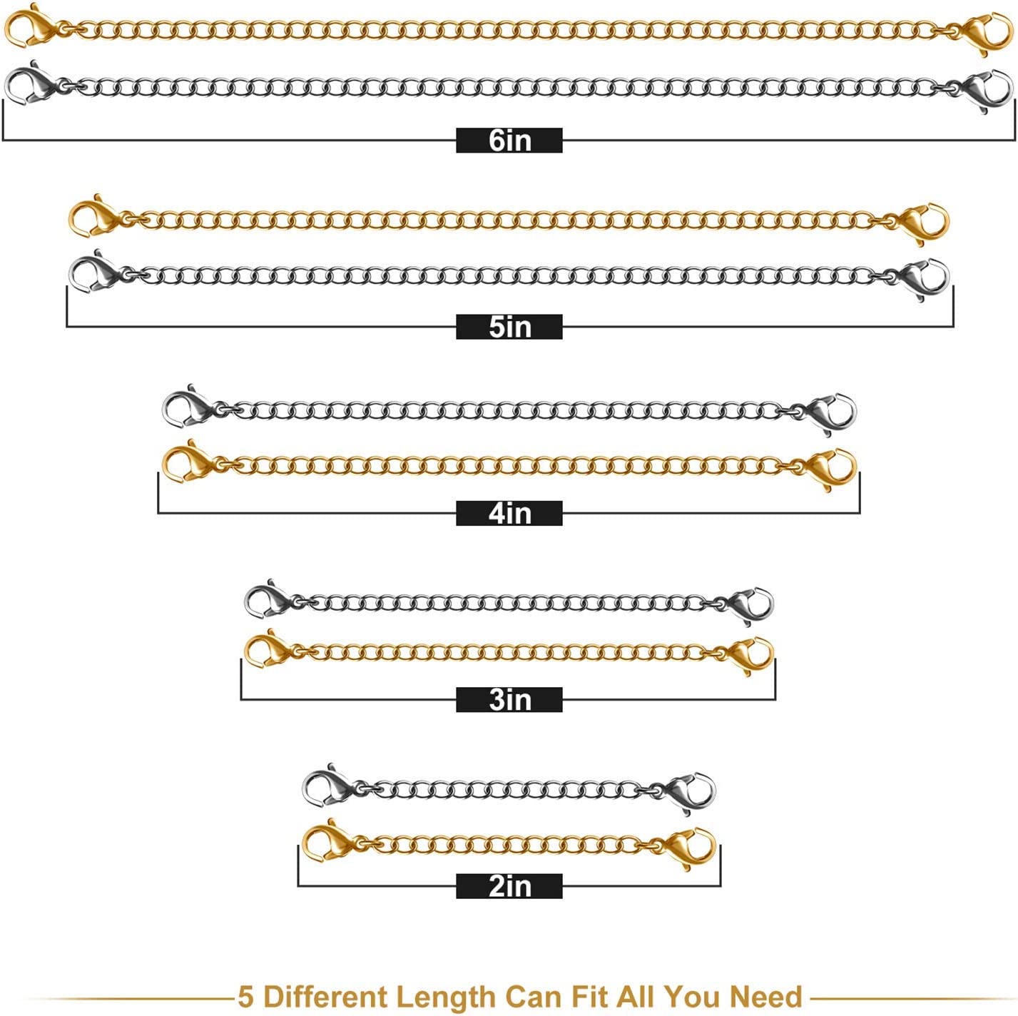 Necklace Extenders, 10Pcs Stainless Steel Gold Silver Necklace Bracelet Anklet Extension Chains with Lobster Clasps and Closures for Jewelry Making