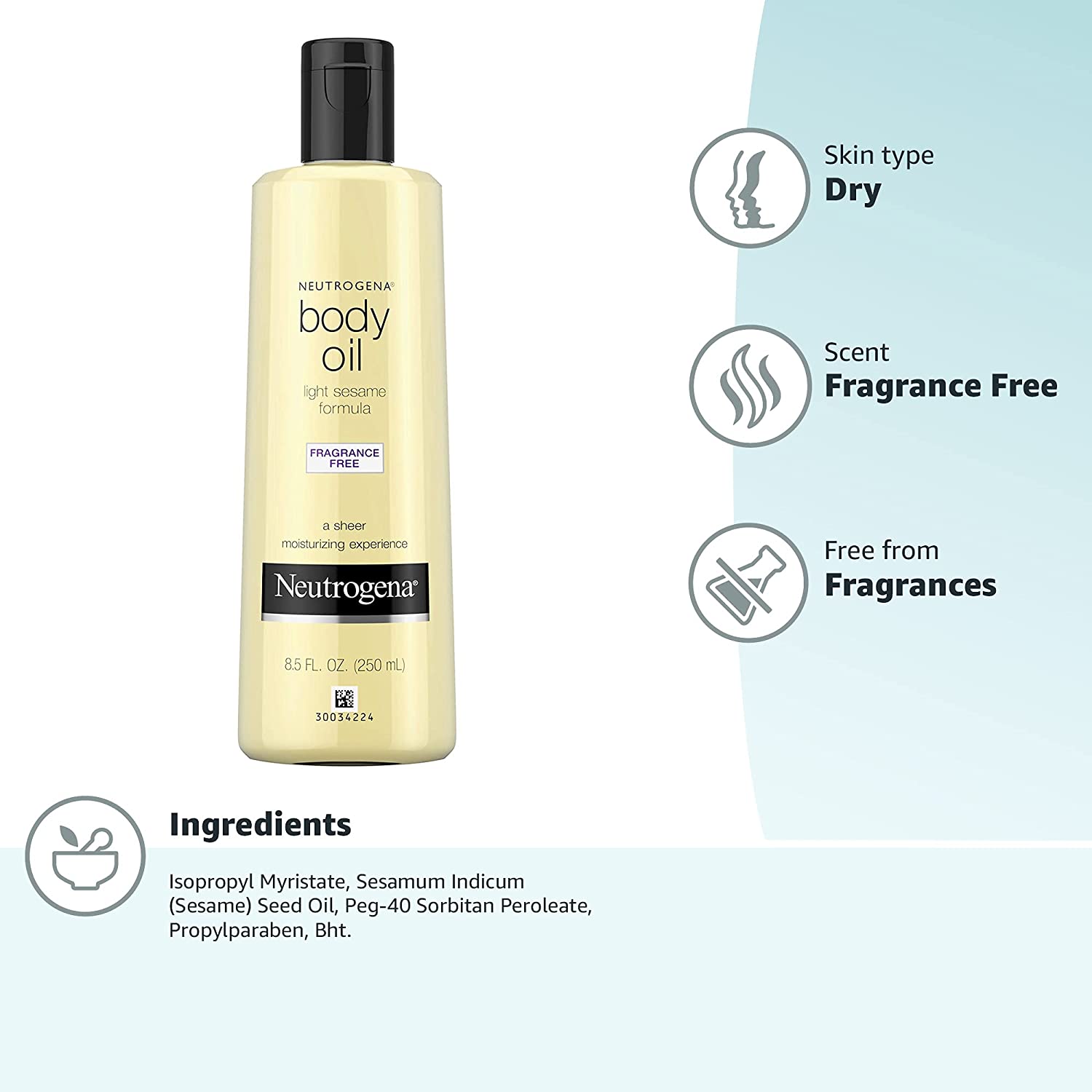 Pamper your skin with Neutrogena Fragrance-Free Body Oil, a sheer moisturizing experience. This lightweight body oil is made with a delicate sesame formula that vanishes into the skin providing essential hydration for dry skin. While your skin is still damp after a shower or bath, smooth on a few drops of body oil. In the bath, add to water to soften your skin while you bathe. This moisturizing body oil is fragrance-free and absorbs quickly, leaving skin feeling soft and silky.