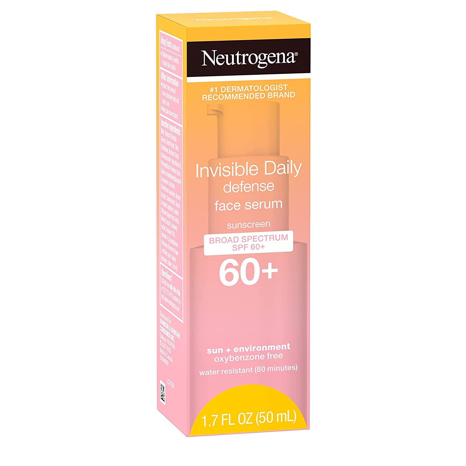 Protect skin from the sun for more radiant skin with Neutrogena Invisible Daily Defense Face Serum with SPF 60+ sunscreen. This oil-free facial serum from the #1 dermatologist recommended sun care brand is invisible on all skin tones and guards against the sun and environmental aggressors while helping even skin tone. The hydrating serum with SPF 60+ helps prevent sunburn with broad spectrum UVA/UVB protection and fights against signs of skin aging due to UV exposure, such as wrinkles, dark spots, fine lines, and sagging. Lightweight and gentle, the skin-hydrating serum is infused with ginger extract to improve skin radiance and an antioxidant complex to help fight environmental factors like cold, ozone, and pollution. The non-greasy serum is invisible on all skin tones and is oxybenzone-, paraben-, oil- and mineral oil-free. Ideal for daily use, the sun care serum is water- and sweat-resistant for up to 80 minutes.