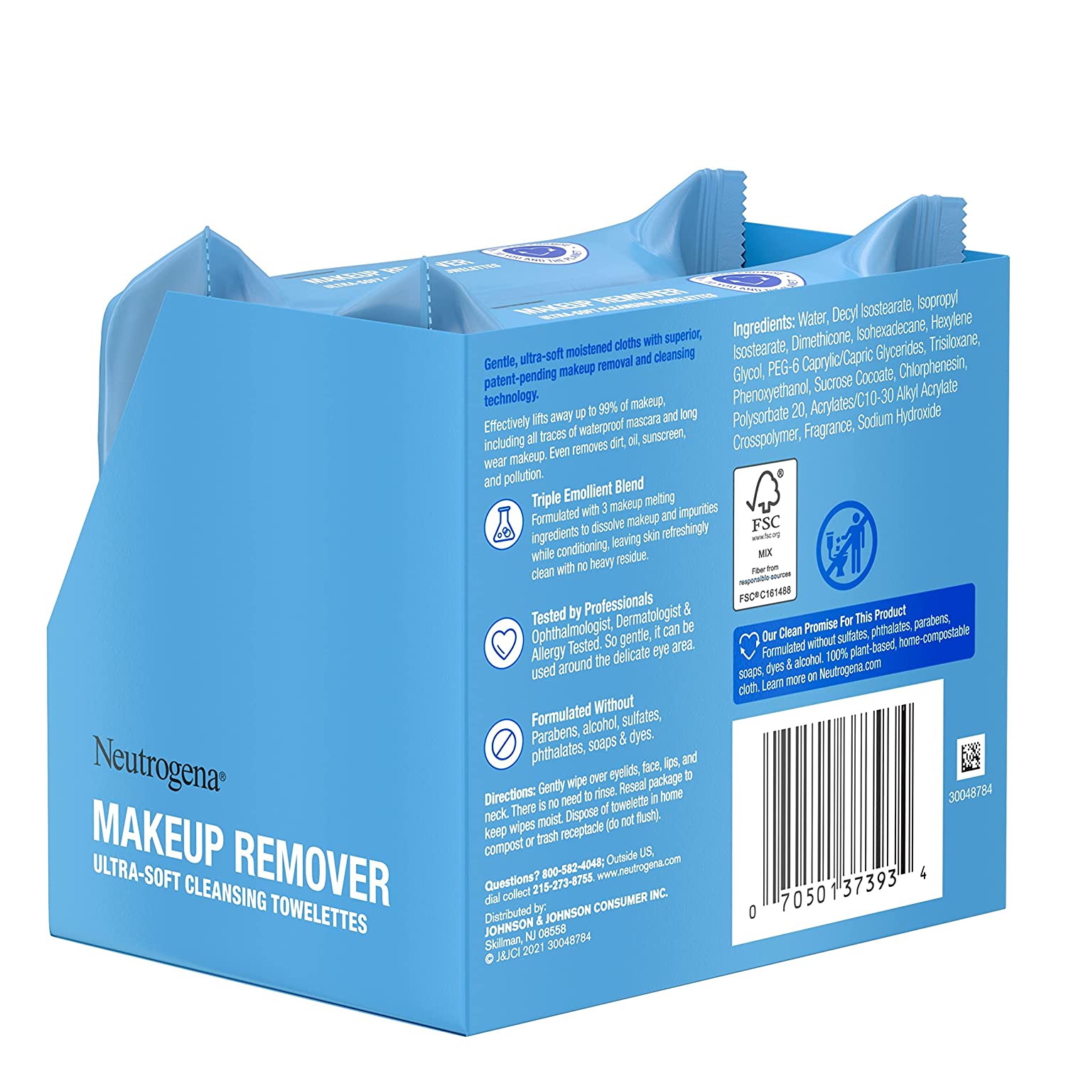 Remove makeup in one easy step with Neutrogena Makeup Remover Face Wipes. These soft and gentle pre-moistened facial cleansing towelettes effectively dissolve all traces of dirt, oil and makeup--even waterproof mascara-- for clean, fresh looking skin every day. Our makeup remover features an effective micellar-infused, triple emollient formula that leaves skin feeling refreshed, nourished, conditioned and thoroughly clean with no heavy residue. These facial towelettes also remove sweat, sunscreen, and pollution from skin with no need to rinse after use. These daily face wipes are formulated to be gentle on the sensitive eye area. The makeup removing wet wipes are formulated without phthalates, parabens, sulfates, alcohols, soaps, or dyes and are ophthalmologist-, dermatologist-, and allergy-tested. Designed with the earth in mind, the compostable wipes are made with 100% plant-based fibers and biodegrade in 35 days in home compost.