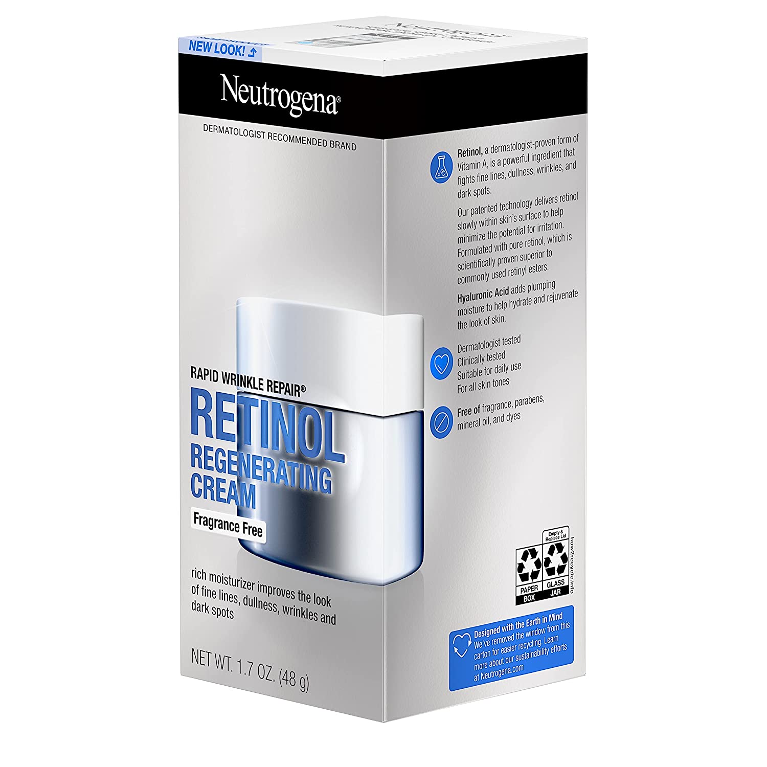 Get visible results with Neutrogena Rapid Wrinkle Repair Retinol Regenerating Cream. This fragrance-free anti-wrinkle face & neck cream smooths the look of fine lines and provides moisture-rich replenishers. The retinol face & neck cream helps fade the look of deep wrinkles, including crow's feet and forehead and cheek wrinkles. Our clinically proven anti-wrinkle formula, this rich fragrance-free facial moisturizer delivers retinol, a dermatologist-proven form of vitamin A and powerful ingredient that fights fine lines, dullness, wrinkles and dark spots, deep within skin's surface quickly and effectively, for visibly smoother and younger-looking skin in just one week. Hyaluronic acid adds plumping moisture to help hydrate and rejuvenate the look of skin. Regenerating Retinol Cream is suitable for daily use in a skincare routine on all skin tones. Plus, it is free of parabens, mineral oil and dyes and comes from the #1 retinol brand used most by dermatologists.