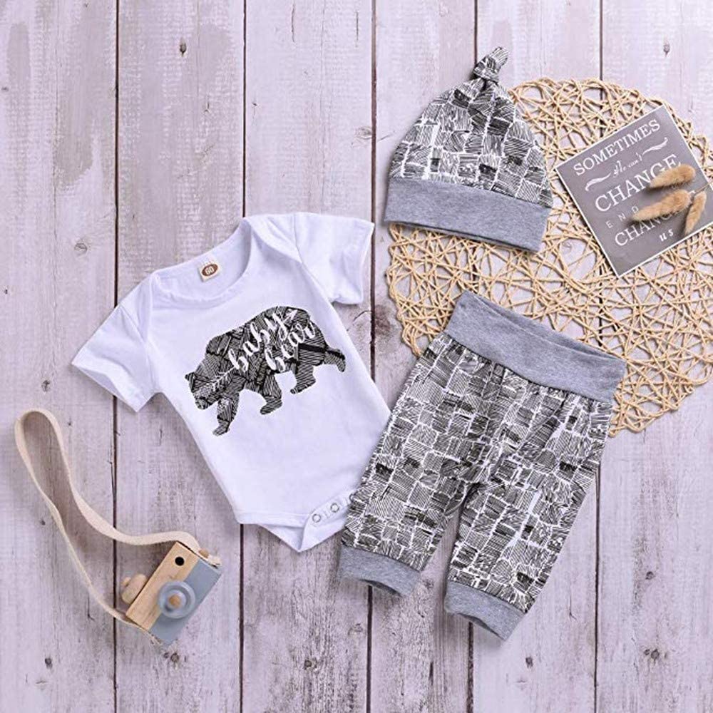 Newborn Baby Boy Clothes Baby Bear Letter Print Romper+Long Pants+Hat 3PCS Outfits Set White