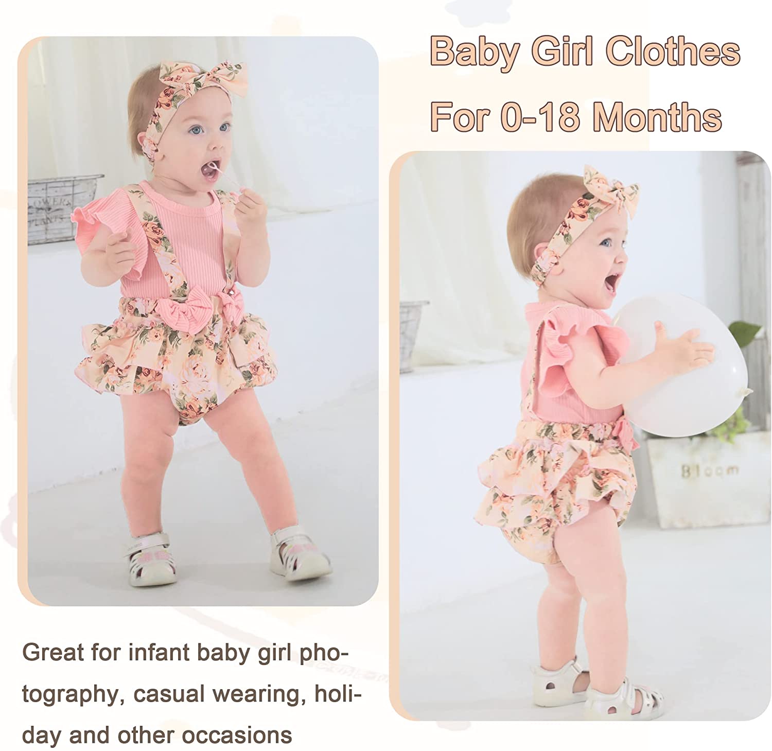 Newborn Baby Girl Clothes Infant Romper Floral Suspender Dress Ruffle Sleeve Onesie Outfit Jumpsuit Headband Spring Summer