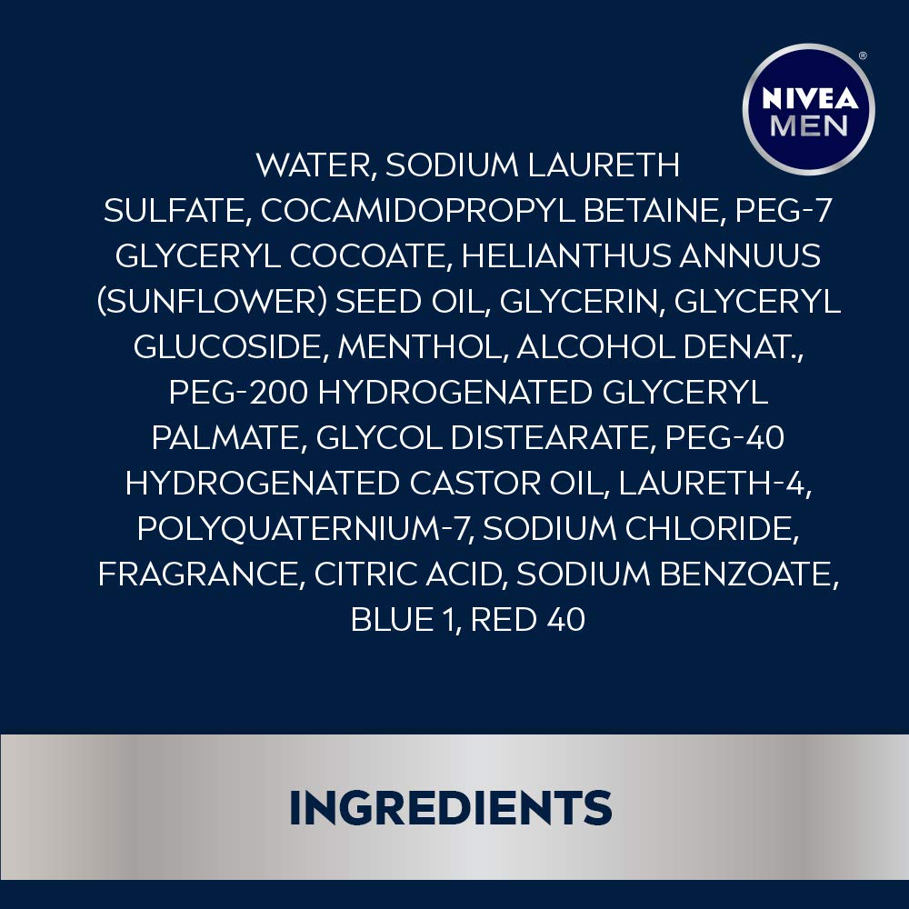 Take care of your skin with NIVEA MEN Cool Body Wash. This body wash gently cleanses and leaves skin feeling comfortable. NIVEA MEN Cool Body Wash is formulated with Menthol for a cool, icy feel. This NIVEA body wash for men can be used for shaving, and as a shampoo and body wash that is specifically crafted for men's skin needs. The refreshing formula does not dry out skin, making it great for everyday use. It is also free of phthalates, parabens and microplastic particles. With a long-lasting masculine scent and icy menthol notes, this body cleanser provides a revitalizing shower experience that leaves skin feeling cared for long after the shower. A refreshing body wash is a key part of a skin care routine and pairs well with NIVEA MEN Maximum Hydration Nourishing Body Lotion. To use, rub scented body wash into a lather while gently massaging over body and rinse.