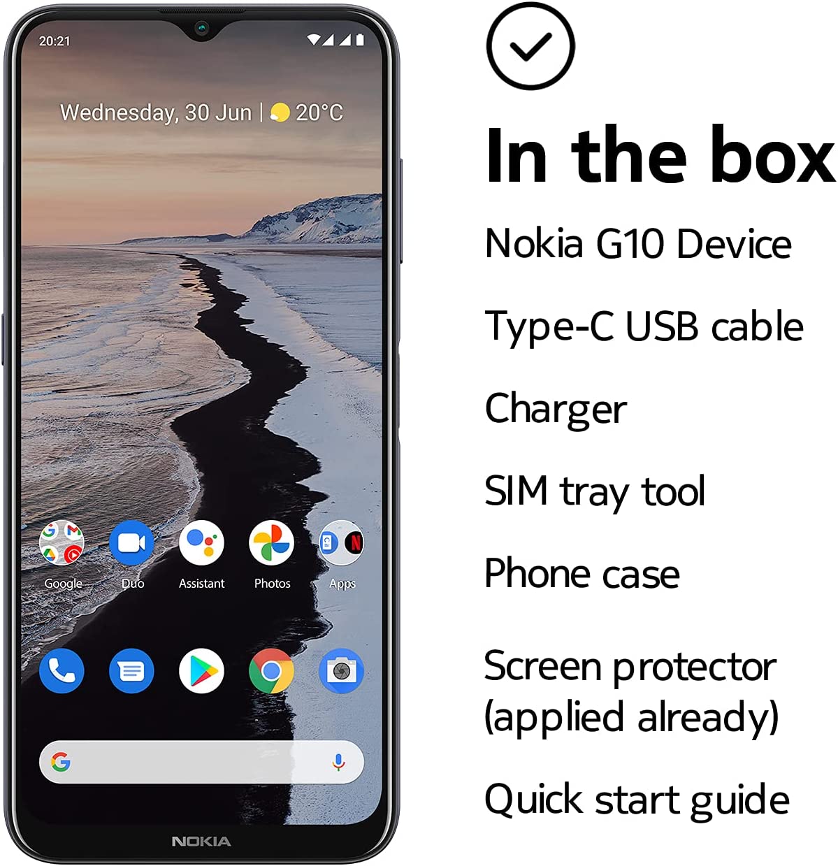 To make the most of family life, you need plenty of energy. Luckily for you, Nokia G10 has a battery that goes days between charges – for more time to captivate your kids on the bigger screen. And with a triple rear camera, complete with enhanced imagery, you’re always ready to catch those special moments. Plus, when you reach the end of the day, there’s still plenty of power for you to unwind – why not call a friend, or catch up on your favorite show? Compatibility: This device is designed to work with GSM carriers. This product will not support Verizon or Verizon subsidiaries. Please confirm compatibility with your chosen carrier before purchasing. For support with SIM card or network related issues, please contact your carrier for assistance in connecting your device to the chosen compatible network. Supported Network bands: 2G: 850 / 900 / 1800 / 1900 3G: 850 / 900 / 1700(AWS) / 1900 / 2100 4G/LTE: 1, 2, 3, 4, 5, 7, 8, 12, 13, 17, 28, 66 Charging: This product is designed to be charged using the charging adapter and charging cable that are provided in the product box. Charging this device with any other charging adapter or cable may cause device malfunction. Please observe basic safety steps when charging this device and do not charge this product with malfunctioning or damaged equipment. Current Software Version: Android 10 Bluetooth Version/Range: 4.2 – 30’ Range FAQ How can I install available updates? In many cases updating your product to the latest software version will alleviate any issues experienced. To update your device please navigate to Settings > System > System update > Check for update to check if updates are available. Follow the on screen prompts to install the latest software version if available.= How can I close an app that has stopped working? Open Settings on your phone and select Apps. Then find the app you're having issues with and select Force Stop. I want to conserve battery life. How can I activate the Power Saver mode? On your phone, open Settings, then choose and activate Battery Power Saving. Please also be aware that battery life depends on a variety of factors such as device usage frequency, application requirements, your current operating system, and cellular signal strength. How can I back up my files? Navigate to Settings > System > Backup, and switch backup on. How can I reset my smartphone's network settings? Navigate to Settings > Network & Internet > more_vert > Reset. Performing this reset may help if you're having connection issues. How do I connect my phone to my carrier network? If your Nokia phone and network are compatible, place your SIM card in the SIM card tray using the included SIM card removal tool to open the SIM tray. Once your SIM card has been inserted into the device, power on your phone and proceed through the product setup steps. If you are not able to connect to your network after finalizing the product setup, please contact your carrier support for additional assistance as every carrier has different steps to assist you in ensuring your product connects to their compatible network. How can I ensure other people hear me on my microphone? If you are experiencing microphone issues with your device and your product has a Google Assistant button, please ensure that the Google Assistant button is not stuck or dirty as this will cause the microphone to not function as intended. If the Google Assistant button is not obstructed, please ensure that there is no dirt or debris in the headphone port of your product. If the headphone port is also clear, please disable the microphone permission of the Google Assistant, by going to Settings > Apps & Notifications > Google App > Permission > Microphone > Deny. How can I turn up the volume to my speaker? First, please ensure that there is no dirt or debris in the headphone port of your product. If your headphone port is clear, please make sure that “Do Not Disturb” is not enabled. To disable this setting, navigate to Settings > Do not disturb. Make sure this is toggled off. If Do Not Disturb is off, navigate to Settings > Sounds and vibration > Volume > move the Media slider to the right to increase volume and test your speaker. If you are still not able to hear any audio, check the settings of the application that you are using from the Settings menu as many applications will have their own volume settings. Why is my phone feeling warm, closing apps or occasionally slowing down? During extended operation, the device may feel warm. In most cases, this is normal. To avoid getting too warm, the device may automatically slow down, dim display during a video call, close apps, switch off charging, and if necessary, switch itself off. If the device is not working properly, take it to the nearest authorized service facility. How do I reboot my smartphone when it’s not responding? If your phone is unresponsive, you can perform a “soft reset” by pressing the volume up key and the power button simultaneously for about 15 seconds (or until phone vibrates). Your phone should then restart momentarily. This is a safe and quick way to reboot your device without losing or erasing any data. My phone won’t charge. What should I do? First ensure the issue isn't with the power source or socket you're using - you can quickly check this by plugging your phone into a different outlet, then checking if it charges. If the socket is not the issue, try taking a closer look at the power cable or charging port on your phone, ensuring everything appears as it should. Then, try turning your phone off completely and plugging it into the socket - bear in mind if the battery is completely drained, it might take up to 2 or 3 minutes to start charging. How can I contact support? Our customer support page offers a number of ways that you can contact support. Please visit the Nokia website for further assistance. How do I fix touch sensitivity issues on my phone? Before performing any additional troublesh