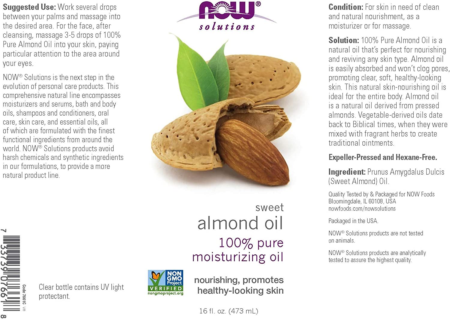 100% Pure Almond Oil is a natural oil that’s perfect for nourishing and reviving any skin type. Almond oil is easily absorbed and won’t clog pores, promoting clear, soft, healthy-looking skin. This skin-nourishing oil is ideal for the entire body and is derived from pressed almonds. Ingredient: Prunus Amygdalus Dulcis (Sweet Almond) Oil.