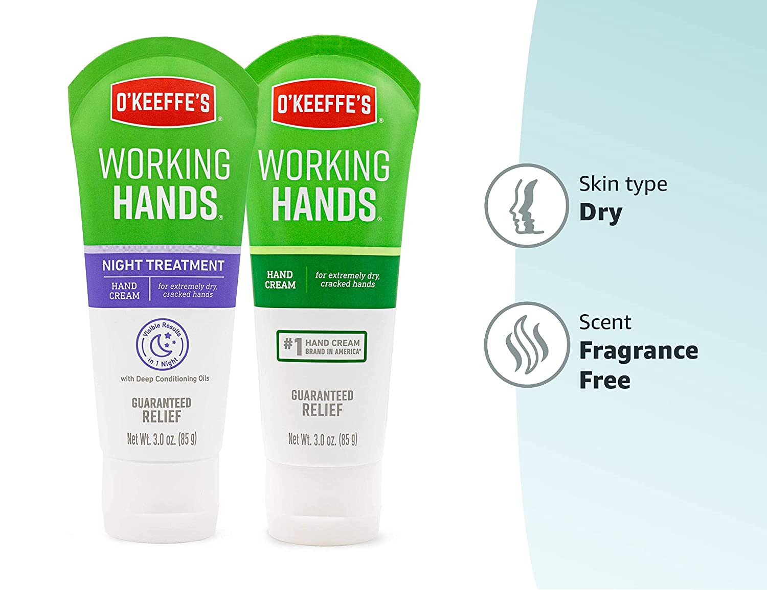 O’Keeffe’s Working Hands Hand Cream is a concentrated, unscented hand cream that heals, relieves and repairs extremely dry, cracked hands. When used daily, O’Keeffe’s Working Hands Hand Cream is clinically proven to instantly boost moisture levels, help prevent further moisture loss, create a protective barrier on the skin’s surface, and make a difference you will feel within days. O’Keeffe’s Working Hands Night Treatment is a calming yet intense, restorative hand cream that is to relieve extremely dry, cracked hands while you sleep. Visible results in as little as one night.