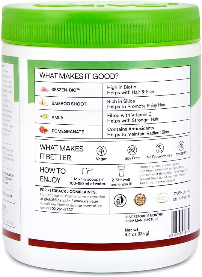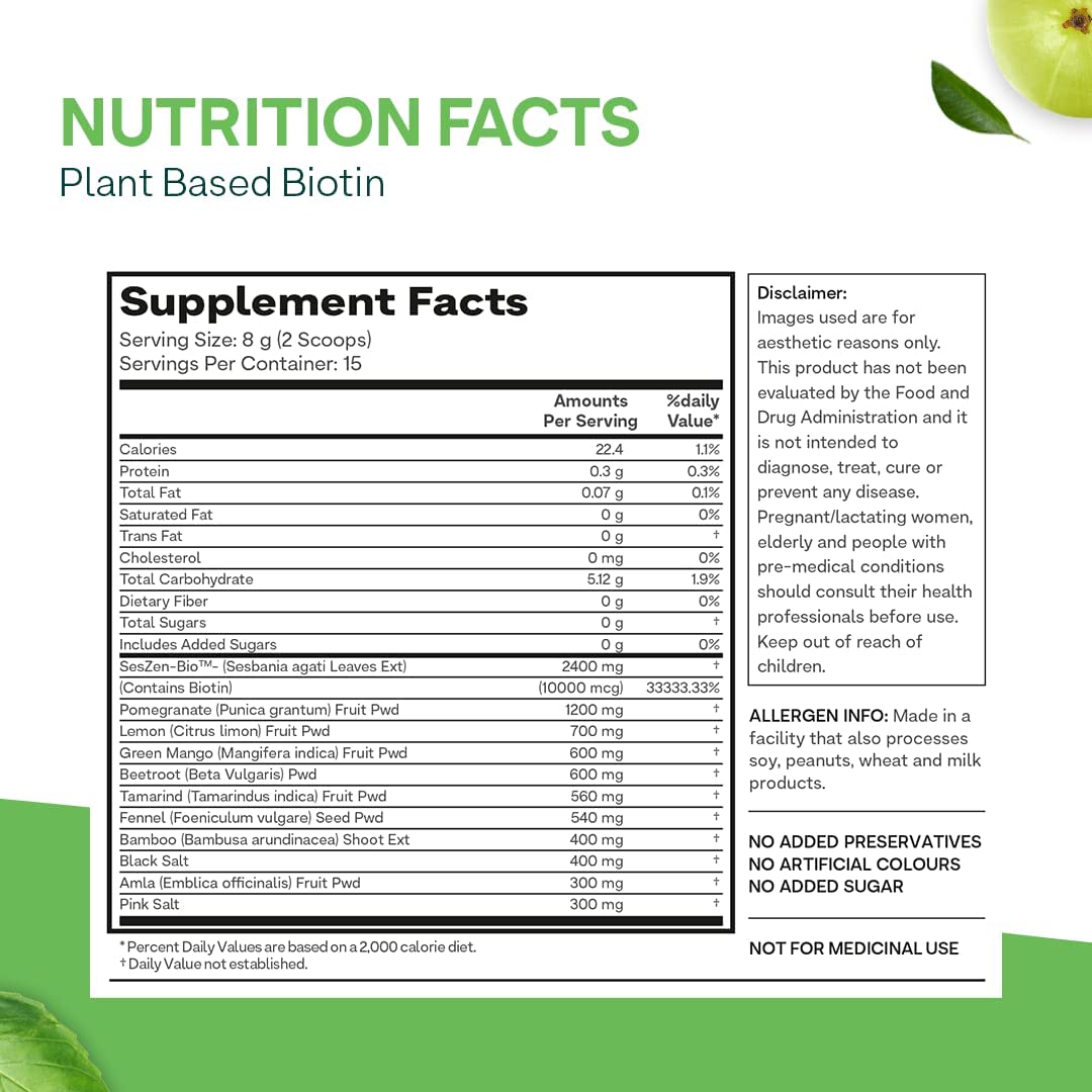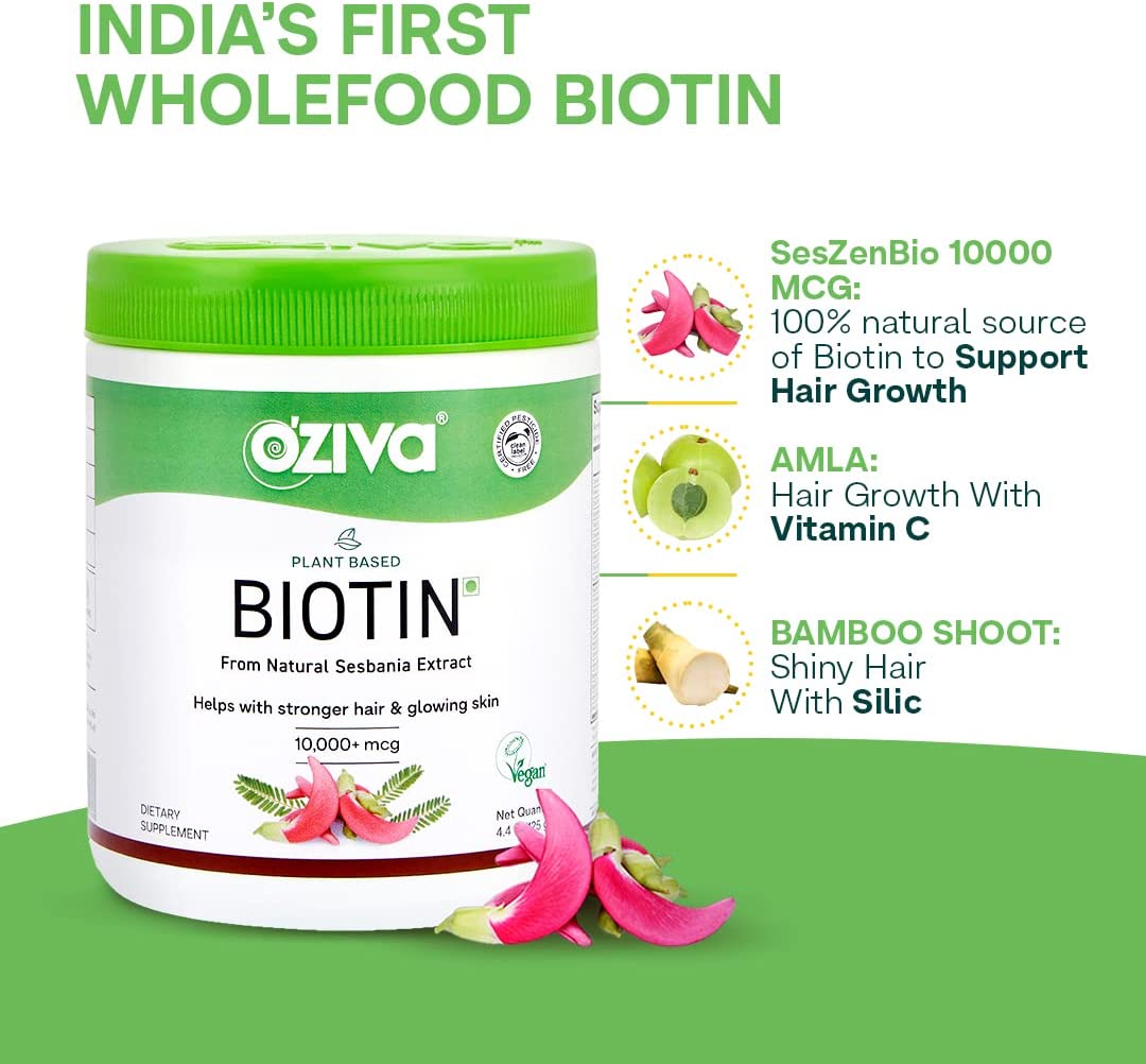 OZiva Plant Based Biotin for Hair Growth| Biotin Powder for Hair Follicle Stimulation & Healthier Texture, Skin, Nails & Body (with Silica, Sesbania Agati), Certified Clean & Vegan, 125g