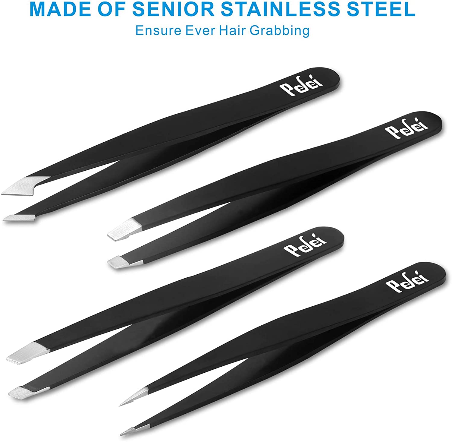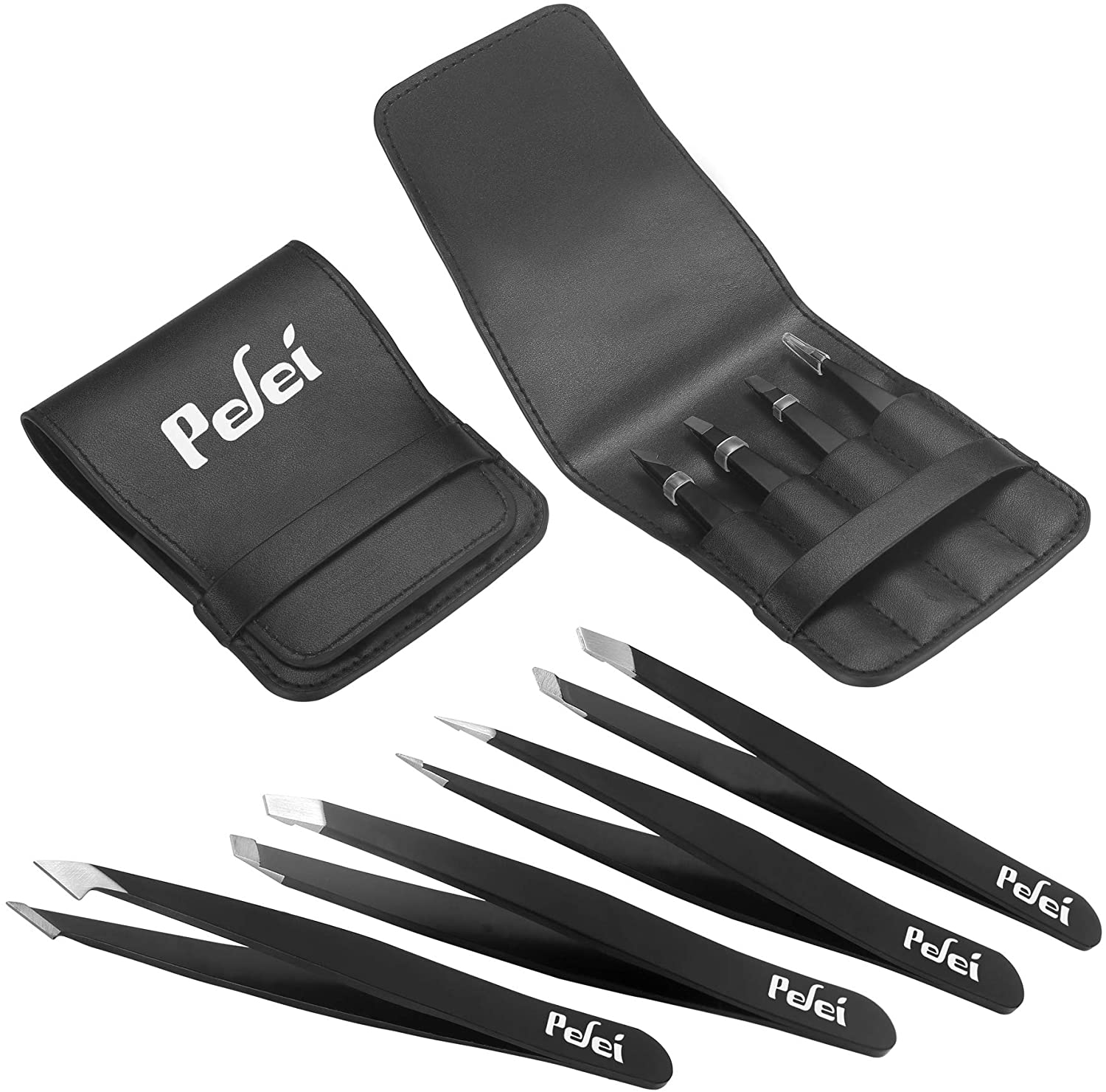 Pefei Tweezers Set - Professional Stainless Steel Tweezers for Eyebrows - Great Precision for Facial Hair, Splinter and Ingrown Hair Removal (Black)