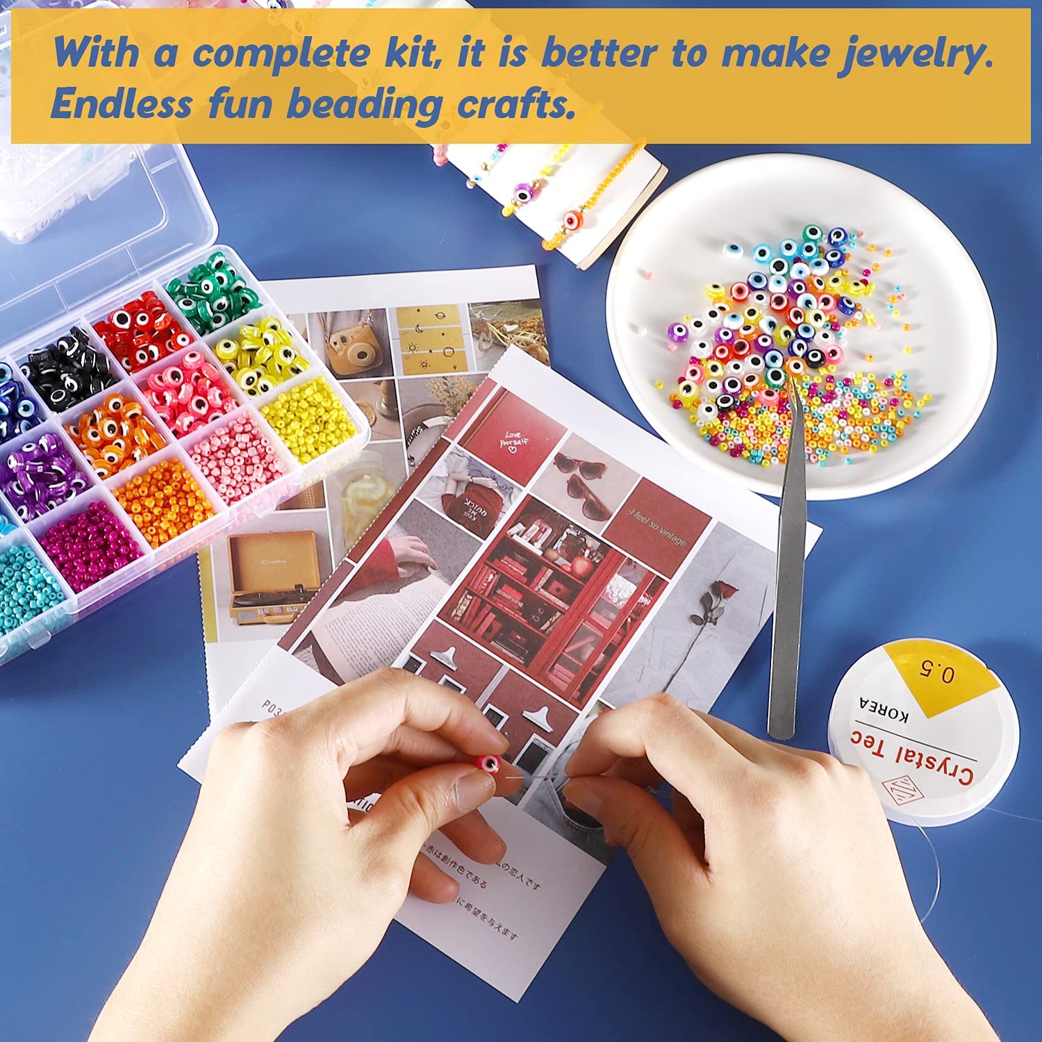 PHUNTTEK 2400pcs Seed Beads and Evil Eye Beads for Jewelry Making, 3mm Glass Seed Beads 8mm Flat Evil Eye Easter Beads Decors Colorful Bracelet Beads Kit for Bracelets Making DIY Beading Supplies