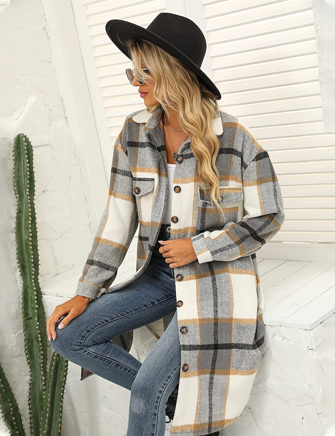 PUWEI Women's Long Flannel Plaid Jacket Shacket Cozy Lapel Button Down Shirt Jacket Fuzzy Trench Coat