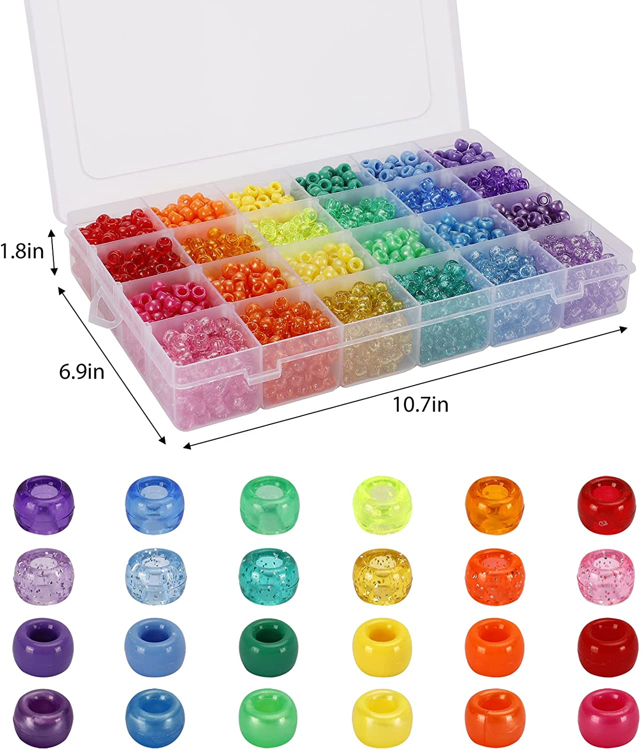 Quefe 2880pcs Pony Beads Kit Rainbow Beads Plastic Bead for Craft 6 x 9mm 24 Colors 4 Styles Large Hole Beads Set for Bracelets Jewelry Making