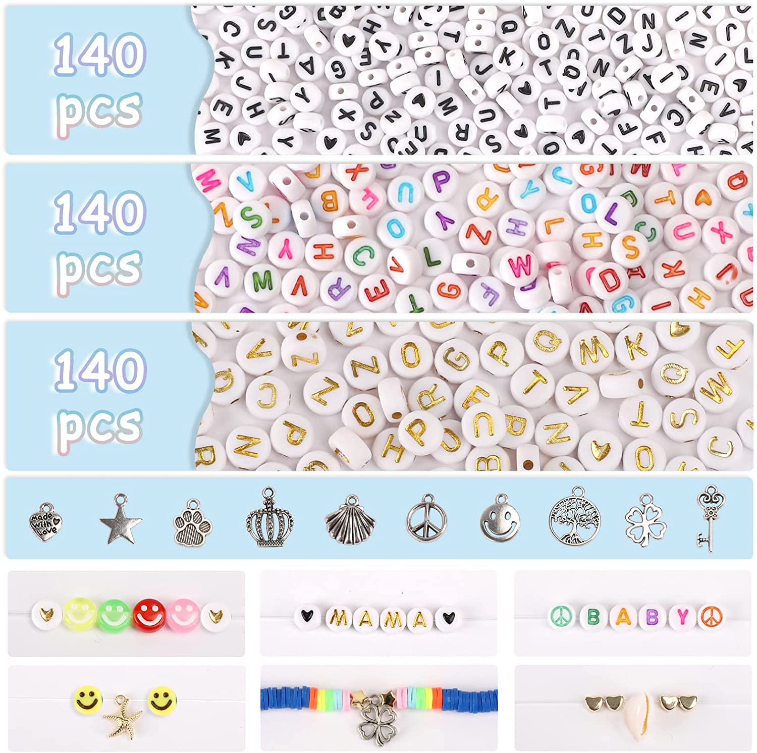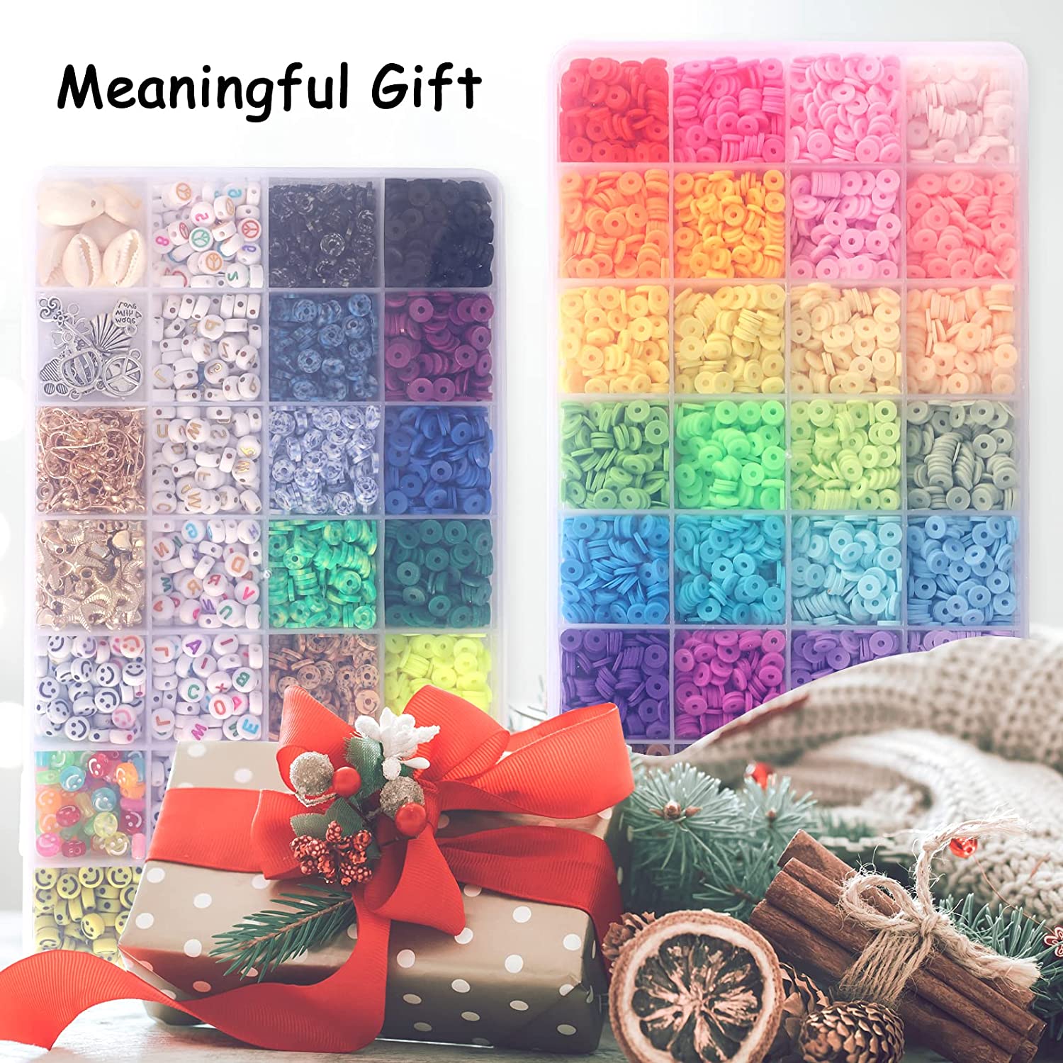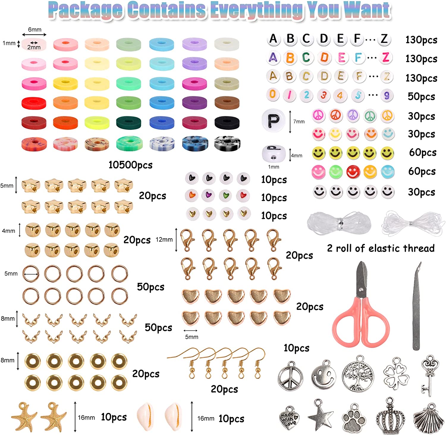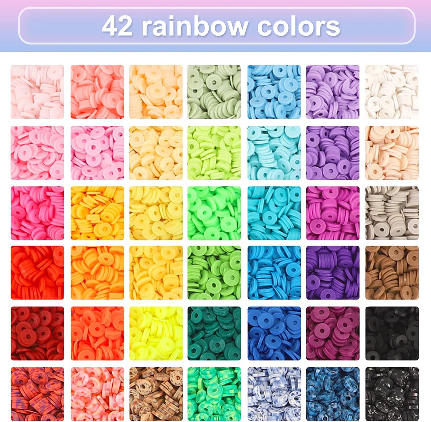 QUEFE 42 Colors Clay Beads for Bracelet Making with Letter Smiley Face Peace Beads Different Styles Charms Pendants, Flat Round Polymer Clay Heishi Beads Kit with Elastic Strings for DIY Craft Jewelry