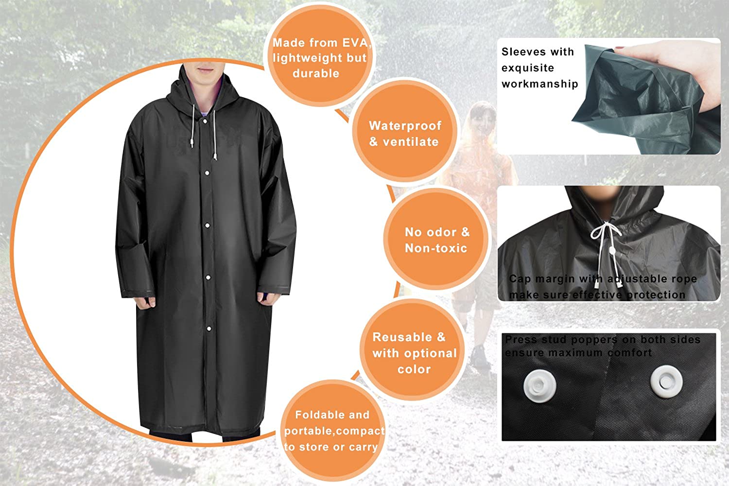 Rain Ponchos For Adults, EVA Reusable Raincoat With Hoods And Sleeves, Portable Rain Coats