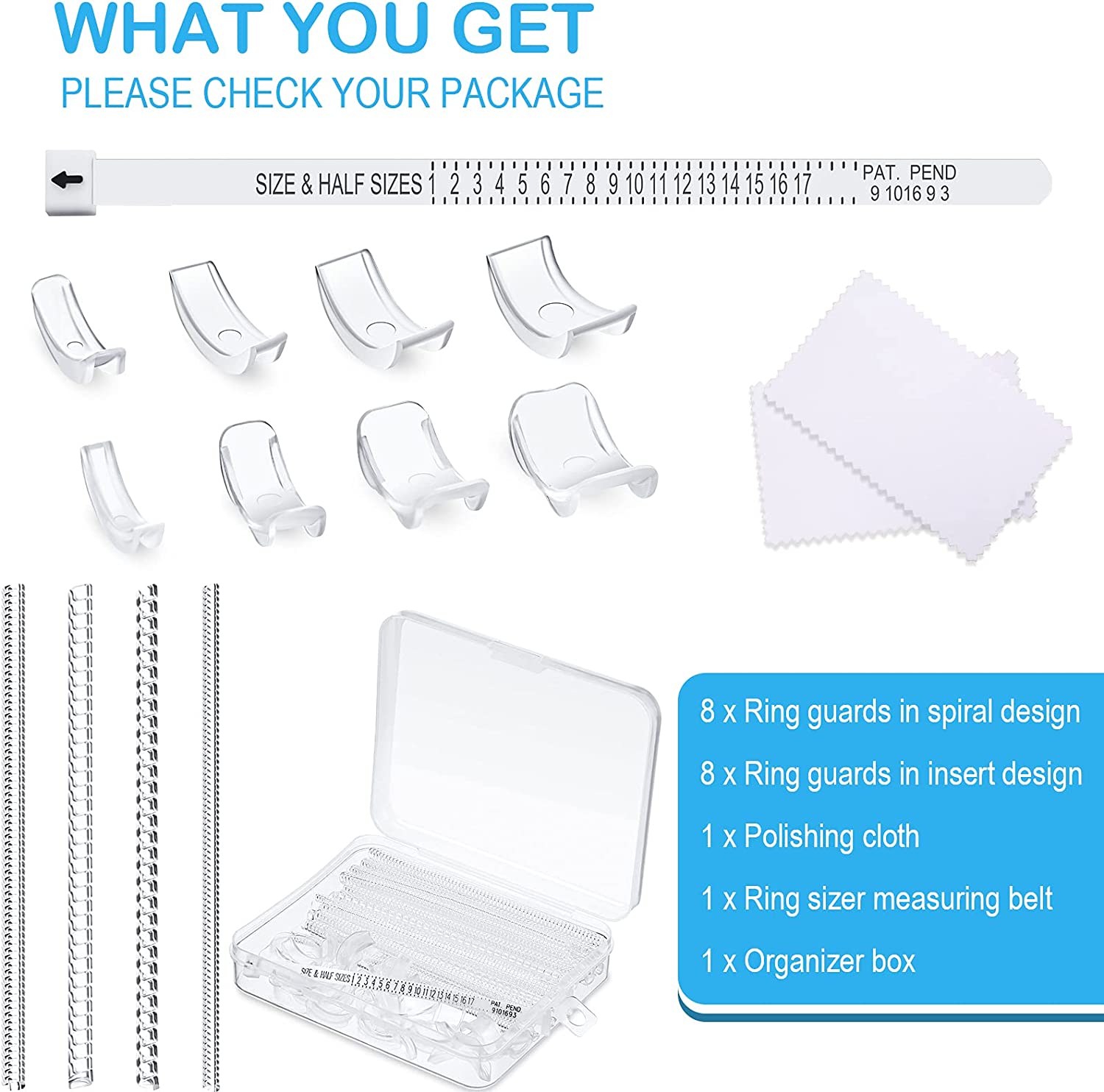 Ring Size Adjusters Set for Loosing Rings in 2 Styles, 12 Sizes, Ring Size Reducer Spacer Ring Guard Ring Resizer Tightener with Ring Sizer Measuring Belt, Jewelry Cloth and Organizer (16 Pieces)