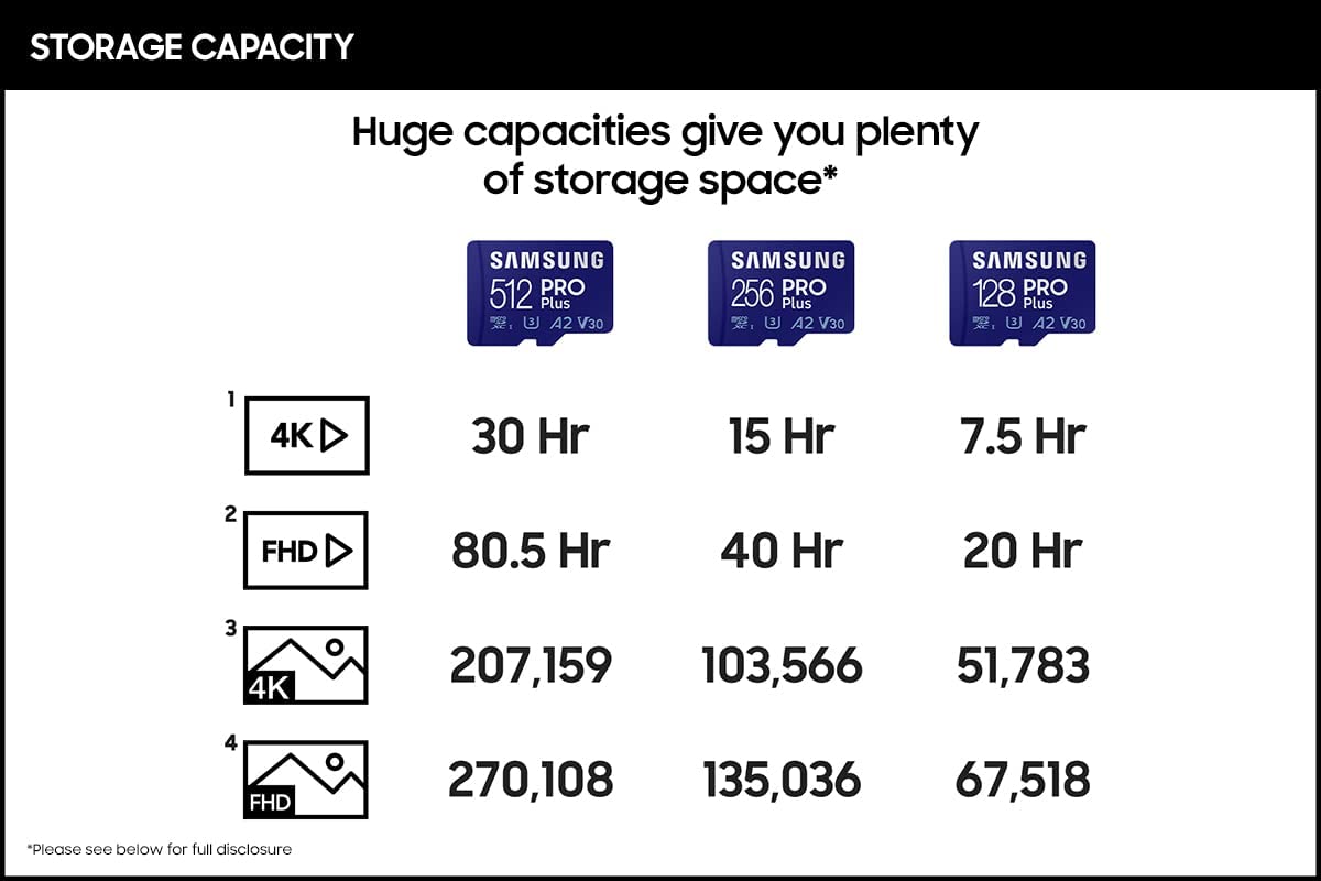 Your new go-to card + adapter combo, the Micro SD PRO Plus + Adapter makes capturing seamless 4K video on compatible phones or drones a breeze. Plus, the expanded storage provides you the freedom to play more high performance and intensive games on your tablet or gaming device. It’s all the extra space you need from a brand you can count on. ¹Requires a compatible phone or drone capable of filming 4K video. ²Comparisons based on 2020 PRO Plus microSD models. *The foregoing read & write speed performance is based on testing of 512GB capacity under standard conditions; Actual speeds may vary depending upon card capacity; **Stated performance is achieved by using PRO Plus microSD cards with Samsung adapters, ³Waterproof: withstand up to 72 hours in seawater; ⁴Temperature proof: operating temperatures of -25 C to 85 C; non-operating temperatures of -40 C to 85 C; ⁵X-Ray Proof: up to 100mGy, equal to airport X-ray machines; ⁶Magnetic-Proof up to 15,000 gauss, or the magnetic field equivalent of a high-field MRI; ⁷Drop: withstand drops up to 5meters (16.4 feet). ⁸Wearout: up to 10,000 swipes. ⁹Source: 2003-Q3 2020 IHS Markit data: NAND suppliers' revenue market share.