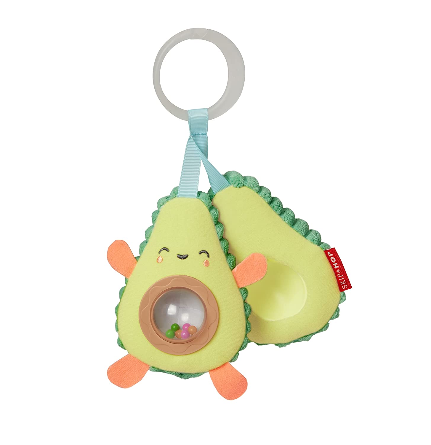 Get ready to guac and roll with our adorable avocado stroller toy. Featuring two halves that are easy for little hands to open and close, inside they’ll find (surprise!) a peek-a-boo rattle “pit.” The plush, textured exterior and cute felt details make this a fresh and fun way to entertain baby wherever you go. Like all our stroller toys and portable baby toys, it has a built-in loop and ring so you can easily attach it to the bar of your stroller, infant carrier or other gear.