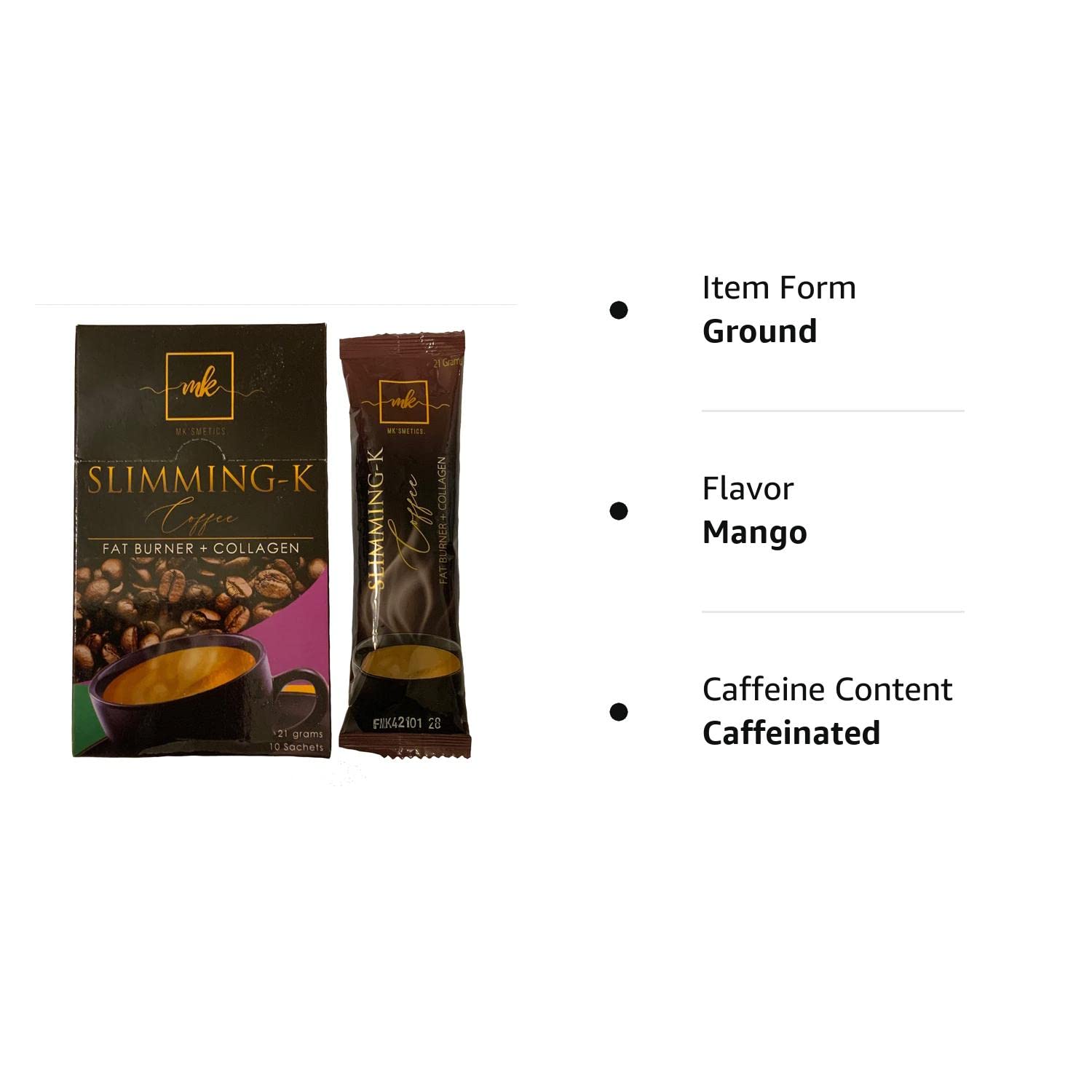 You can ask the sellers for Virtual ID for authentication verification SLIMMING-K Coffee by Madam Kilay, Fat Burner + Collagen Mix Drinks - 21g x 20 Sachets Ingredients: Coffee, Non-dairy creamer, Stevia, L-Carnitine, Garcinia Cambogia, Collagen, Panax Ginseng, Aloe Vera Extract, African Mango Extract, L-Glutathione. Directions: Empty contents of one sachet into a glass. Pour 150ml of cold or hot water and stir until completely dissolved. For best results, drink warm water first thing in the morning then Slimming-K coffee 30 minutes before a meal. Can be taken up to 4x a day. Results may vary from person to person. NO APPROVED THERAPEUTIC CLAIMS.