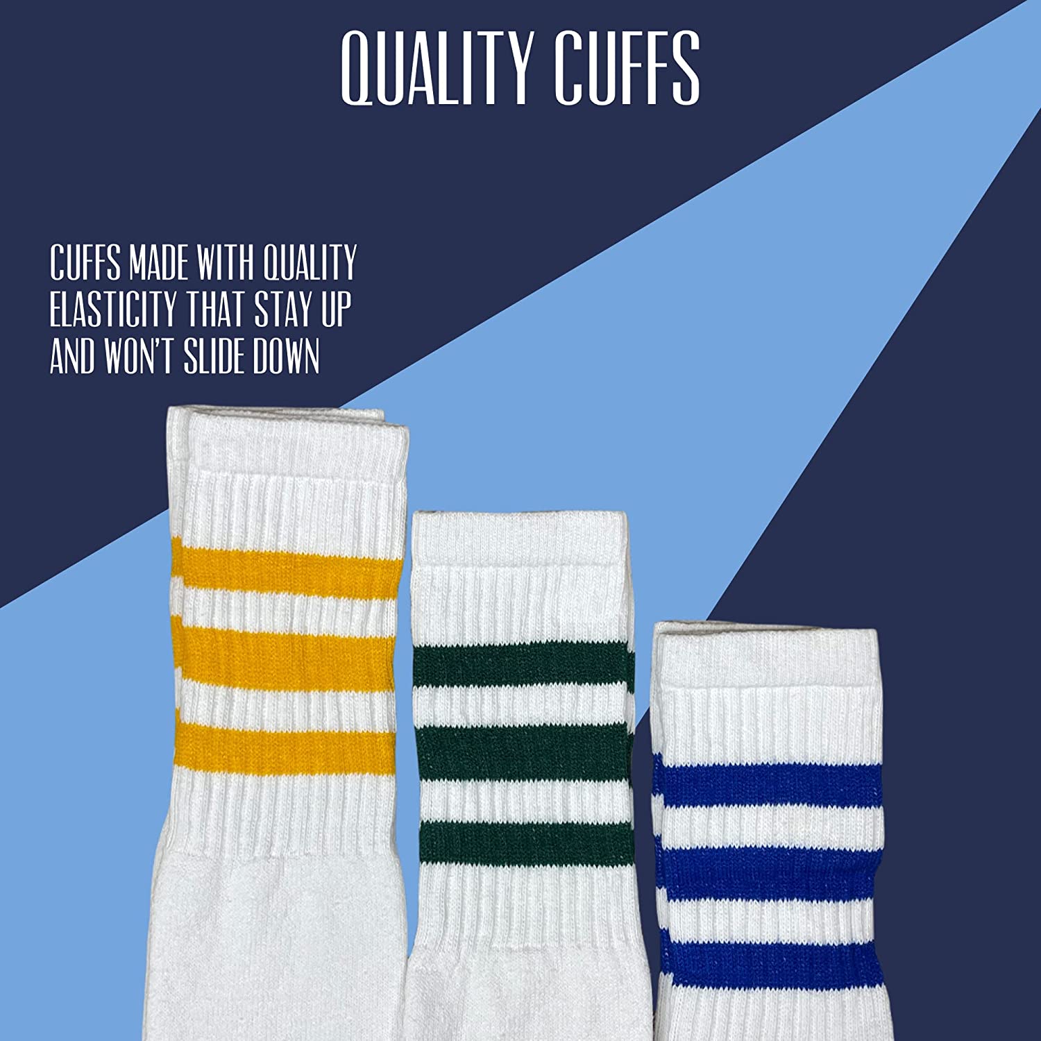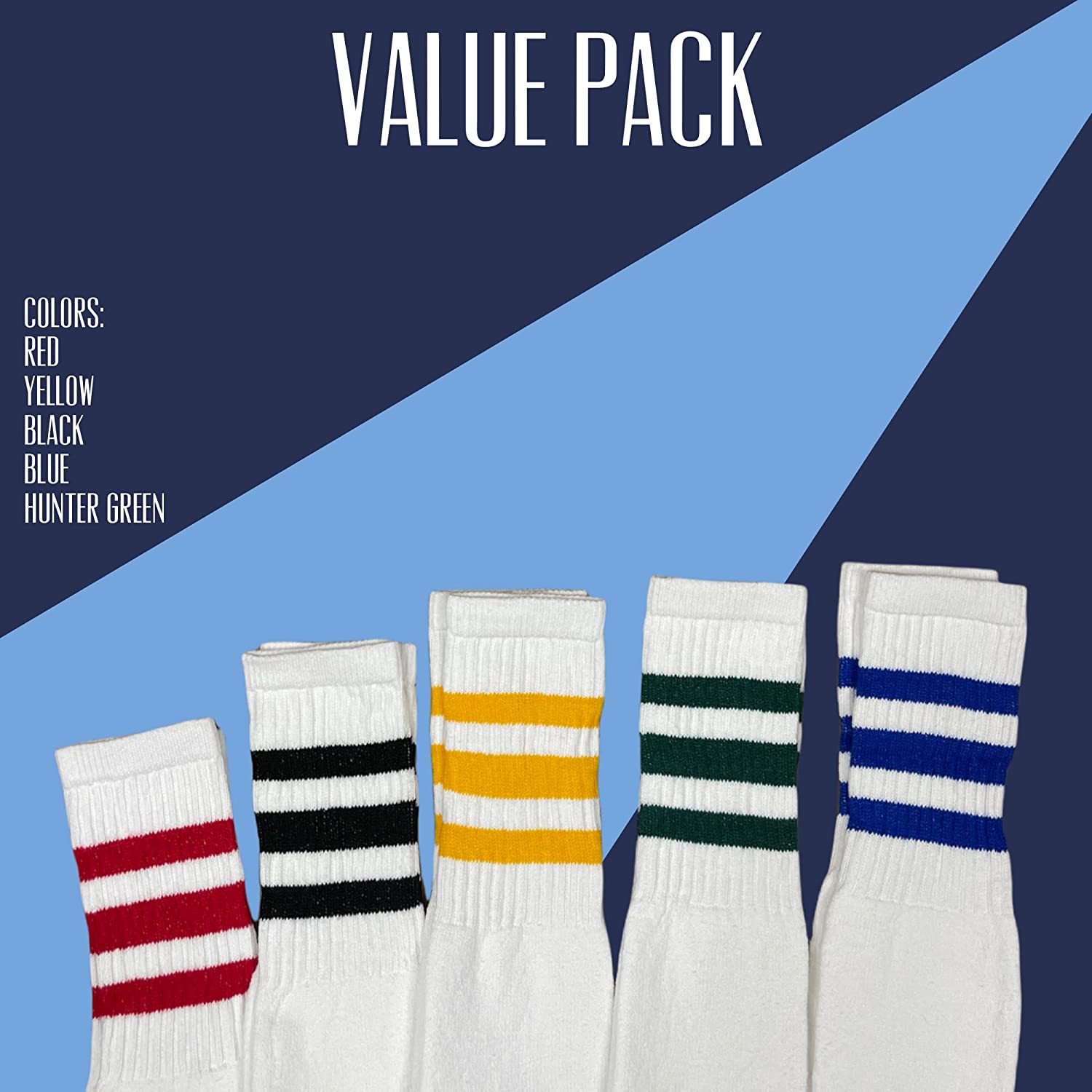 Five Pairs of Classic Tube Socks in Colors Red Blue Green Black and Yellow - Three Stripe Design and these Socks are long Knee High Style Measuring at 24" Inches in Length. High Cotton Blend Material for Comfort and Durability