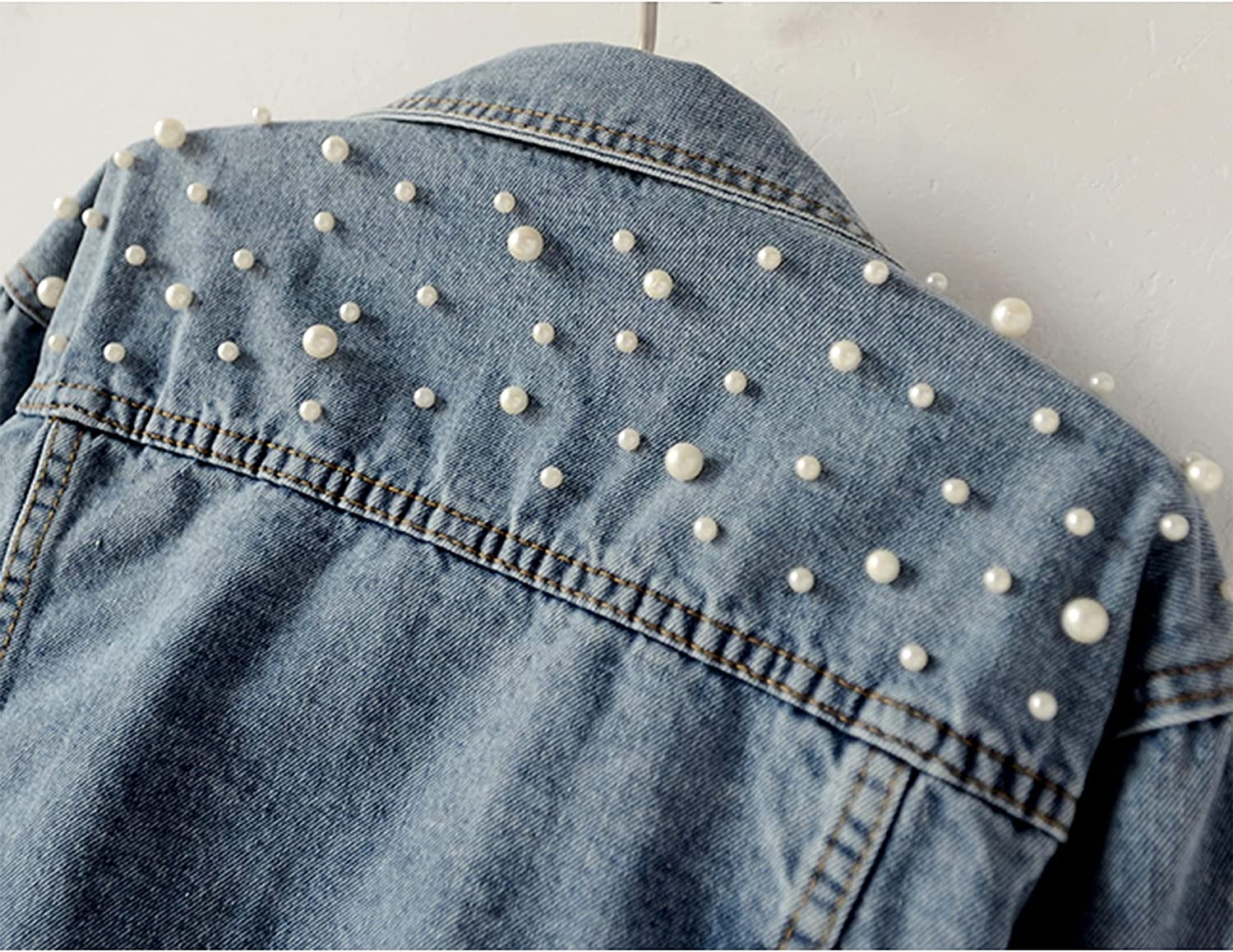 Tanming Women's Casual Embroidered Pearls Beading Denim Jacket Jean Coat