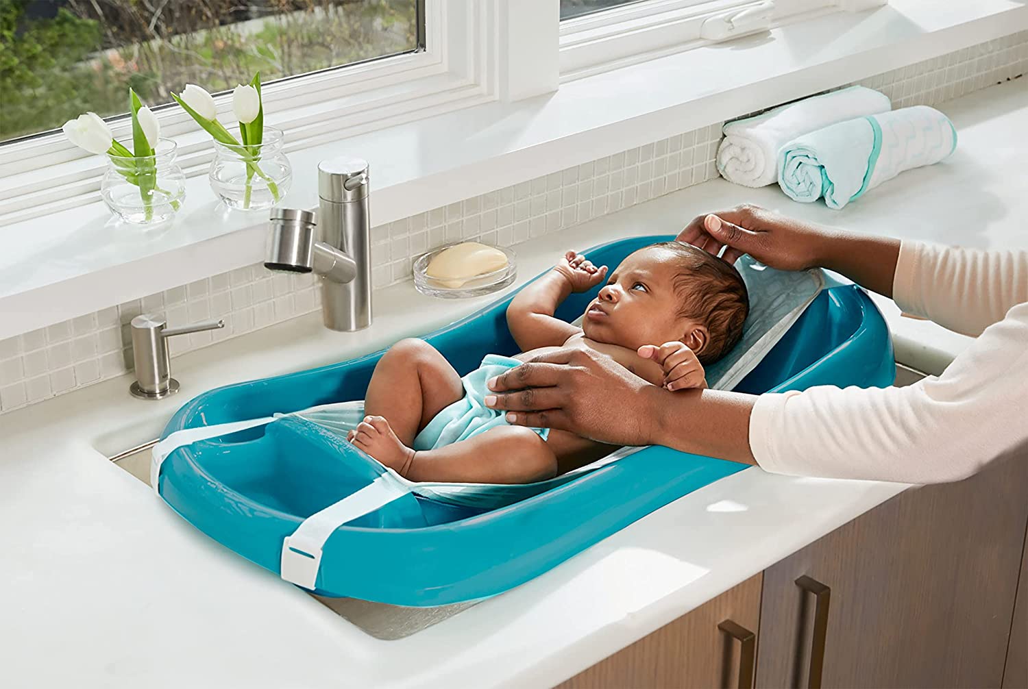 All the security, comfort and convenience parents and growing babies need in a tub. Its deep ergonomic design holds baby better for bathing, and parents will love that it fits both single and double sinks. Plus, the mildew-resistant pads make for a cleaner bath and a special drain plug changes color to alert parents if the water is too hot for baby. From newborn to toddler, bathtime couldn't be better! This deluxe version includes green mesh sling.