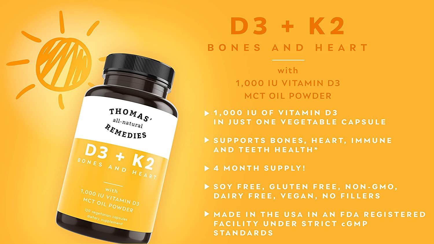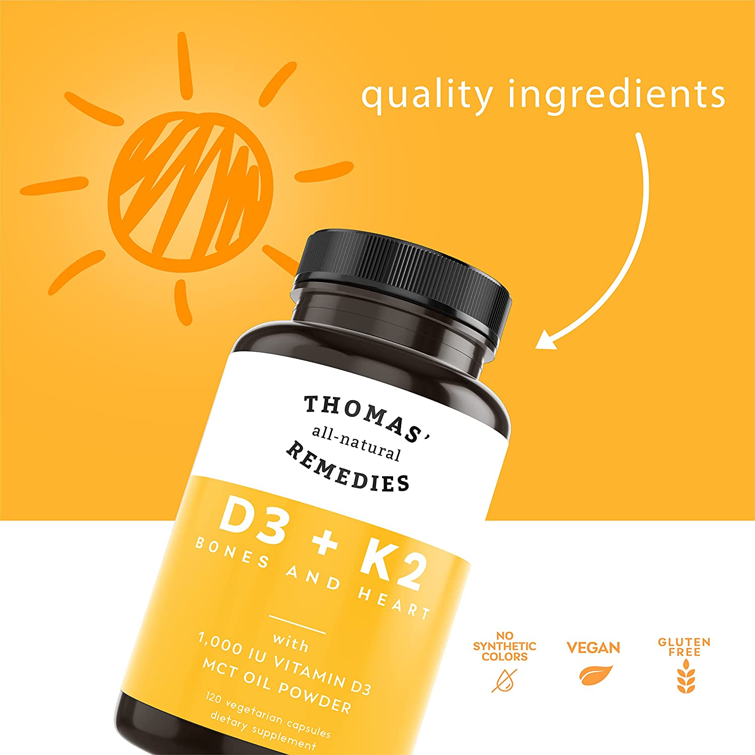 Thomas' all-natural Remedies D3 + K2 with MCT Oil for Better Absorption - 1000 IU D3 - Vegan - Made in USA - Support for Your Heart, Bones & Teeth - Non-GMO - 120ct