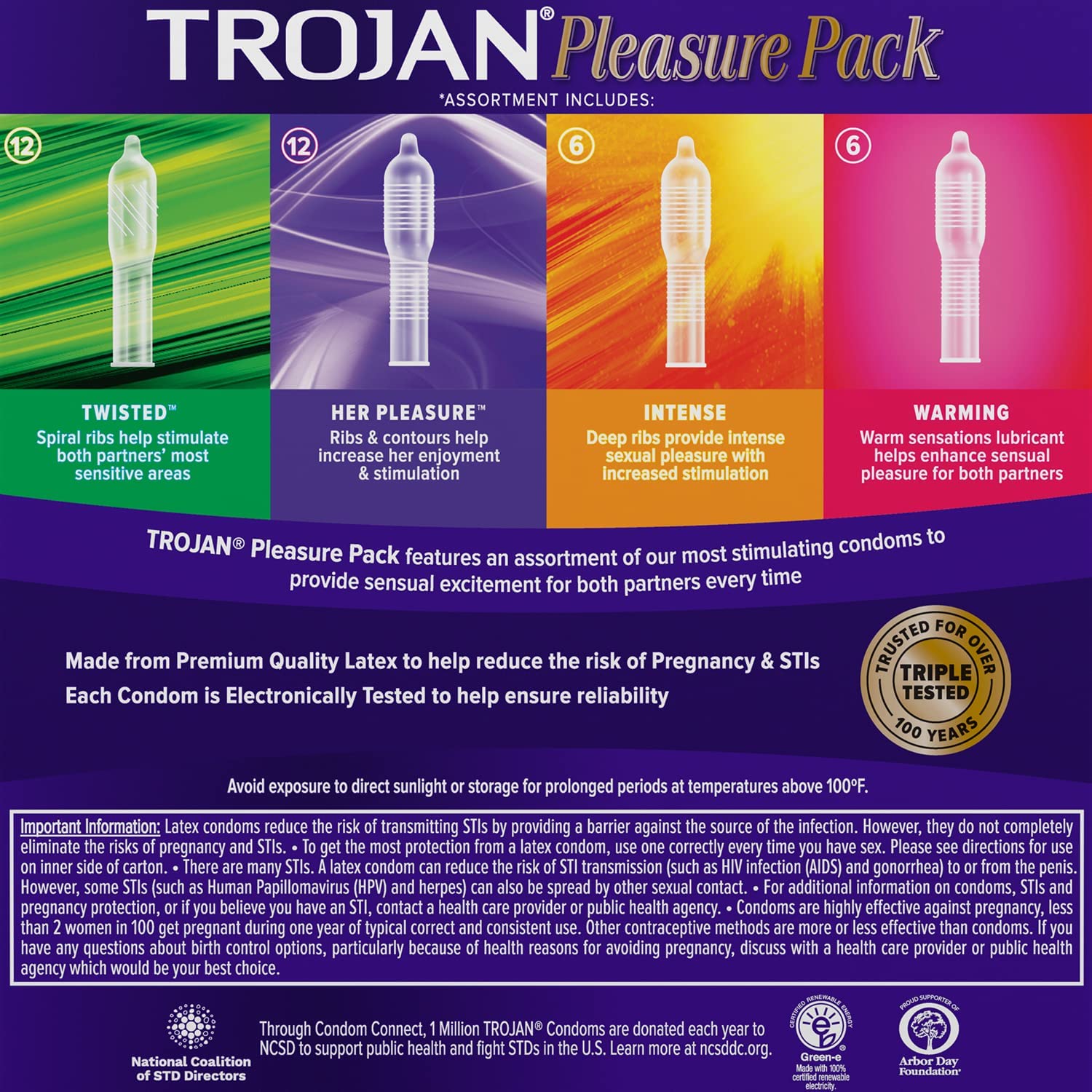Trojan Pleasure Pack features an assortment of our most stimulating condoms to provide sensual excitement for both partners every time. This multi-pack includes Twisted Condoms for intense stimulation, Her Pleasure Sensations Condoms with intense sensations for her, Intense Condoms with a stimulating texture, and Warming Condoms that add a warm sensation. All of the varieties have a silky smooth lubricant for comfort and sensitivity. They’re made from a premium quality latex and are electronically tested to help ensure reliability. These condoms reduce the risk of unintended pregnancy and sexually transmitted infections (STIs) while you play.Includes one 36 count box of Trojan Pleasure Pack Condoms. Trojan Brand condoms are America's #1 condom, trusted for over 100 years. The Trojan Brand promotes a safe, healthy, and fun sex life. From condoms to vibrators to lubricants, Trojan Brand is dedicated to delivering innovative, high-quality products that offer pleasure and protection.