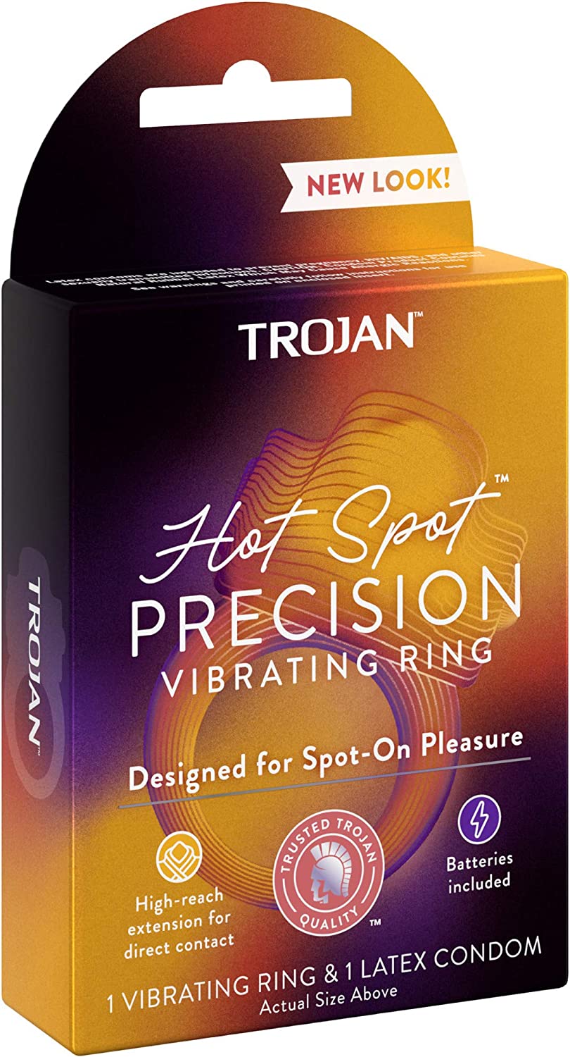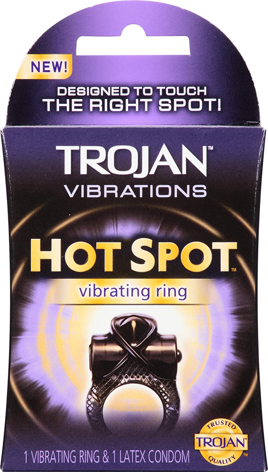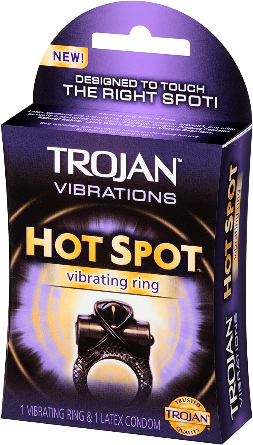 Take pleasure to new heights with TROJAN Vibrations Hot Spot Vibrating Ring. When he puts it on, this ring has a high reach extension for direct contact for her and more intense stimulation during intercourse for both partners. Designed to be used with or without a condom, it delivers spot-on pleasure every time. The vibrations last up to 20 minutes for one time use so you and your partner are guaranteed a night to remember. Includes one TROJAN Vibrations Hot Spot Vibrating Ring. More Americans trust TROJAN Brand than any other condom, for over 100 years, because we’re committed to investing in public health efforts to support sexual health. The TROJAN Brand promotes a safe, healthy, and fun sex life. From condoms to vibrators to lubricants, TROJAN Brand is dedicated to delivering innovative, high-quality products that offer pleasure and protection.